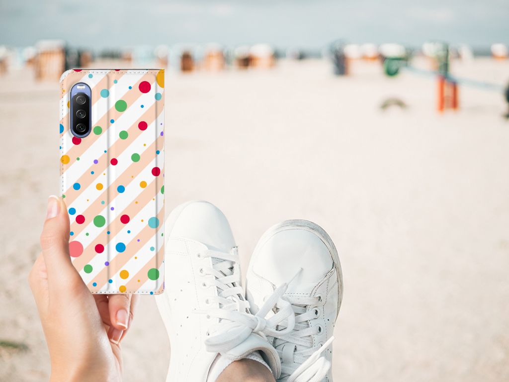 Een Sony Xperia 10 III Hoesje met Magneet met verschillende kleuren stippen is een schitterende bescherming van jouw smartphone. De stand case met het design Dots in alle kleuren van de regenboog komt voor jou als geroepen. Maak je geen gebruik van dit zeer mooie hoesje, dan kan het met jouw smartphone een beetje beroerd aflopen. Dit mooie stand hoesje met verschillende kleuren stippen zorgt voor een volledige bescherming van je smartphone en wordt aan alle zijden bedrukt. Dankzij de speciale standaard kun je rustig achteroverleunend filmpjes bekijken terwijl je je handen vrij hebt. Verder is de houder aan de binnenzijde van TPU. Jouw telefoon is dus zeer goed opgeborgen en kan geen kant op. Met een hoesje met stippen in verschillende kleuren op alle zijden blijft jouw telefoon volledig in tact. Heb je liever een stand case met stippen in andere opvallende kleuren? Ontwerp dan zelf case met je eigen foto’s en teksten!