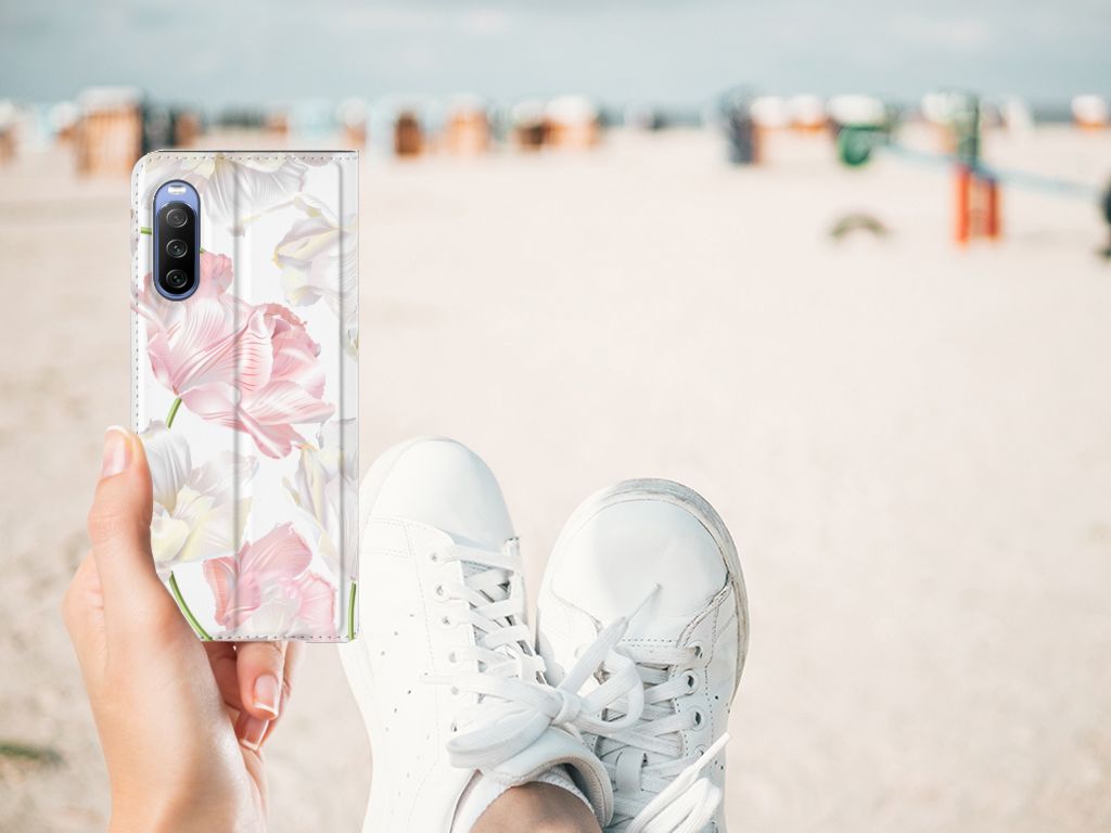 Een bosje bloemen doet een mens (en zijn smartphone) goed. De witte en roze bloemen op dit Sony Xperia 10 III Smart Cover geven jouw smartphone een zeer mooie uitstraling. Je wordt er ook meteen een stuk rustiger van als je aan het appen of aan het bellen bent. Valt dan je telefoon op de grond, dan zal er dankzij de stand case met het design Lovely Flowers ontstaan. Onze stand cases met roze en witte bloemen zien er zeer prettig uit en zijn heel praktisch, wat blijkt uit onder meer het vakje aan de binnenkant en de handige standaard waarmee je de smartphone rechtop op tafel neer kunt zetten. De roze en witte bloemen passen goed op alle zijden van de case. Op deze stand case van leer en TPU (houder aan de binnenkant) kun je trouwens ook je eigen bloemige ontwerp zetten. In een paar simpele stappen maak je zelf een stand hoesje met daarop jouw mooiste bloemen.