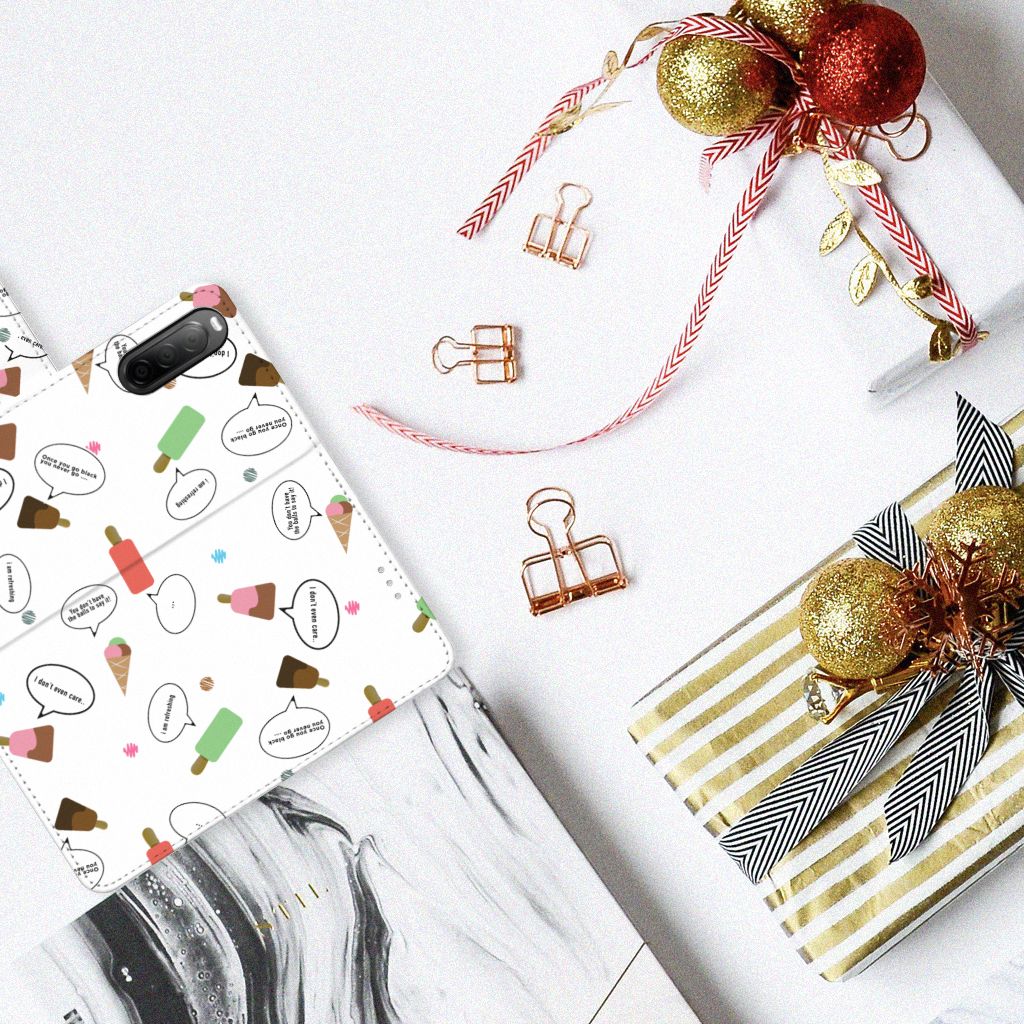 Van dit vrolijke Sony Xperia 10 IV Book Cover met daarop verschillende soorten ijsjes met tekstwolkjes krijg je sowieso een vrij en zomers gevoel. De zomer komt naar je toe met deze print van ijsjes met tekstwolkjes. Ben je op het strand, dan ontbreekt een lekker ijsje natuurlijk niet. Net zoals je je smartphone bij de hand hebt, met daaromheen een design hoesje met bijzondere ijsjes en tekstwolkjes. Jouw telefoon kan dan de bescherming in de vorm van een boekhoesje met ijsjes zeer goed gebruiken. Alle zijden van dit hoesje worden bedrukt met ijsjes en tekstwolkjes. De case heeft een lipje aan de buitenzijde voor het afsluiten van de telefoon en de houder aan de binnenzijde is van TPU. Onder alle weersomstandigheden zal deze case met verschillende opbergvakjes perfect functioneren, ook op het strand met een ijsje in je hand.