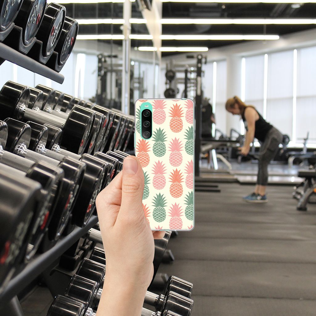 Ananas is een woord uit het Tupi, de taal van de Tupi-indianen, en betekent uitmuntende vrucht. Dit fruit van zeer hoge kwaliteit staat op onze superieure boekhoesjes, stand cases, hard cases en TPU cases. Jij blijft er gezond uitzien als je zo nu en dan een hap neemt van een Ananas , jouw smartphone blijft tip top in orde als je er een leuk telefoonhoesje omheen doet. Een ananas heeft stevig, veerkrachtig vruchtvlees. Een beetje te vergelijken met het TPU in onze hoesjes. TPU is elastisch materiaal, dat zeer buigzaam is. Vandaar dat het zeer schokbestendig is. Het ananas design staat op een staat op een TPU case. Deze Sony Xperia 10 V Siliconen Case wordt alleen aan de bovenkant bedrukt en is zeer flexibel. De randen van het hoesje blijven transparant.