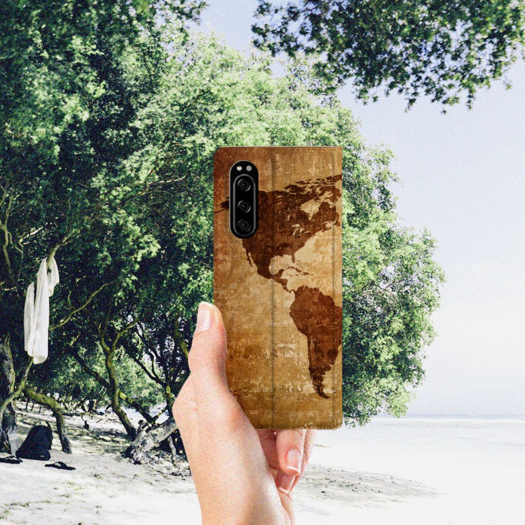 Als je een hoesje koopt met een wereldkaart, kun jij op veilige wijze met je smartphone rond de wereld reizen. Ga je zonder een boekhoesje met wereldkaart het buitenland verkennen, dan loop je veel te groot risico dat je stukken krijgt aan je smartphone. Met als gevolg dat je de belangrijke gebeurtenissen op je reis wellicht niet meer vast kunt leggen om door te sturen aan je vrienden. In het slechtste geval wordt jouw toestel zonder een smartphone hoesje met wereldkaart onbruikbaar. Wij kunnen de wereldkaart bedrukken op een stand case. Een Sony Xperia 5 Book Cover beschermt jouw telefoon aan alle kanten en beschikt over een 1 opbergvakje en een speciale standaard. Het hoesje wordt afgesloten met een magneet aan de binnenzijde. De houder aan de binnenzijde is van TPU. Dit stand hoesje met wereldkaart is voor een zeer laag bedrag te bestellen.