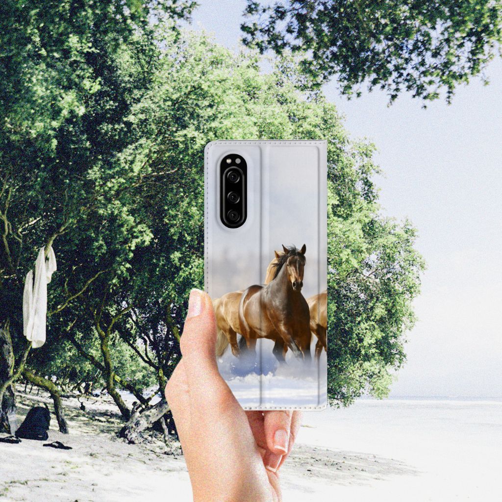 Voor de paardenliefhebbers onder ons hebben we onze collectie uitgebreid met dit design hoesje met print van paarden. Vroeger hield de mens vooral werkpaarden, inmiddels hebben we vriendschap gesloten met het paard. Vandaar dat het ook een favoriet dier is op onze smartphonehoesjes, zoals deze stand cases. Deze Sony Xperia 5 Hoesje maken met Paarden is niet alleen super mooi en chique, het sluit ook nog perfect dankzij de magneet aan de binnenzijde. Verder heeft de case een TPU houder aan de binnenzijde en een houder voor een pasje. Zie je liever je eigen paard terug op een hoesje? Dat kan! Door zelf een uniek hoesje te ontwerpen, met eigen foto’s en teksten. De stand case met paarden wordt aan alle zijden bedrukt.