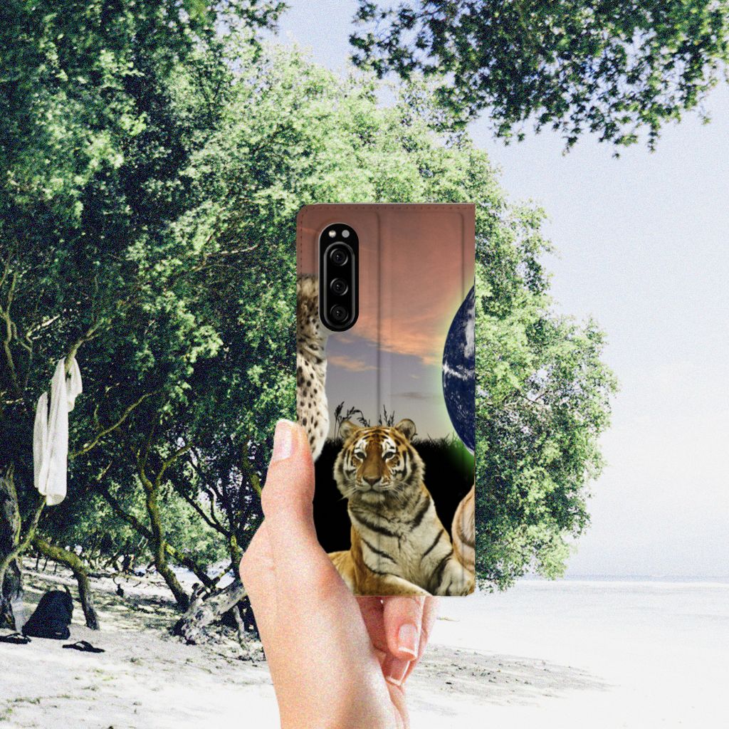 Deze standcase met roofdieren kan exclusief in het bezit van jou komen. Bovendien kun je hier zelf nog unieke teksten en/of beelden aan toevoegen. Je Hoesje maken krijgt dan een unieke identiteit. Roofdieren zoals tijgers op dit hoesje zijn voortdurend op zoek naar een geschikte prooi. De tijgers met aardbol op de achtergrond op deze stand case geven jouw Sony Xperia 5 een hele stoere uitstraling. Deze bijzondere case is van PU-leer (buitenzijde) en TPU (binnenzijde) en beschikt over een houder en een speciale standaard. Verder is deze stand case met roofdieren voorzien van een magnetische sluiting aan de binnenzijde. Je zorgt voor de perfecte bescherming van je smartphone met dit design hoesje met roofdieren met aardbol op de achtergrond.