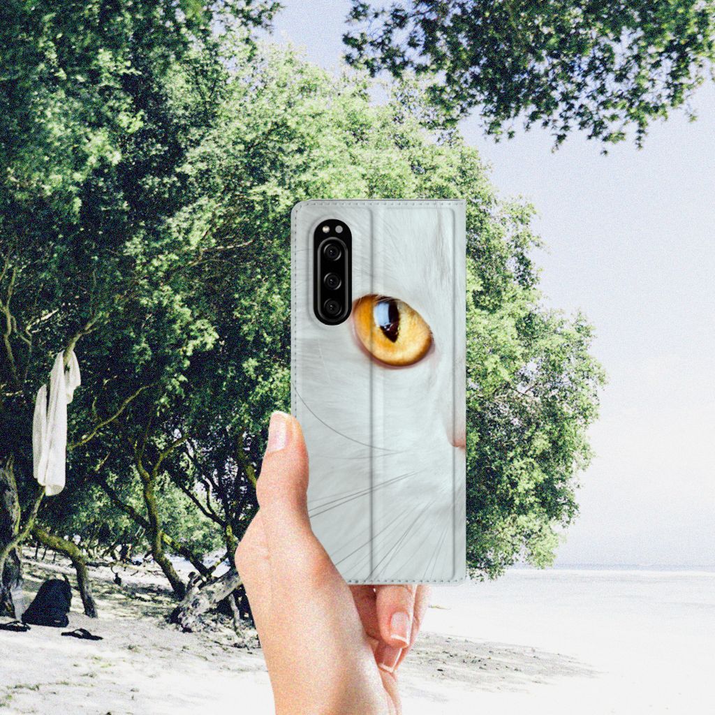 Witte katten zijn natuurlijk extra speciaal, vandaar we een exemplaar op een design hoesje hebben gezet. Een witte kat schijnt trouwens ook slechter te kunnen horen dan katten met een andere kleur. Deze witte kat staat op een zeer prominente wijze op een stand case. Deze stand case met witte kat ziet er geweldig uit en is voorzien van verschillende uitsparingen en een speciale standaard. Een Sony Xperia 5 Hoesje maken met witte kat beschermt jouw smartphone perfect. Alle zijden van de case zijn bedrukt. Jouw smartphone wordt erg duurzaam met dit design hoesje. Het TPU aan de binnenzijde is zeer flexibel en het pu-leer oogt chique. Verder heeft de case een houder voor bijvoorbeeld je rijbewijs aan de binnenkant.