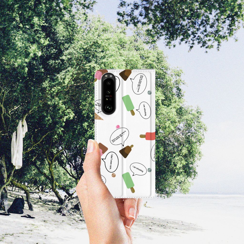 Van deze vrolijke Sony Xperia 5 III Flip Style Cover met daarop verschillende soorten ijsjes met tekstwolkjes krijg je sowieso een vrij en zomers gevoel. De zomer komt naar je toe met deze print van ijsjes met tekstwolkjes. Ben je op het strand, dan ontbreekt een lekker ijsje natuurlijk niet. Net zoals je je smartphone bij de hand hebt, met daaromheen een design hoesje met bijzondere ijsjes en tekstwolkjes. Jouw telefoon kan dan de bescherming in de vorm van een stand case met ijsjes zeer goed gebruiken. Alle zijden van dit hoesje worden bedrukt met ijsjes en dankzij de speciale standaard is het erg prettig om filmpjes te bekijken. De case wordt aan de binnenzijde met een magneet afgesloten en de houder aan de binnenzijde is van TPU. Onder alle weersomstandigheden zal deze case met 1 opbergvakje en ijsjes perfect functioneren, ook op het strand met een ijsje in je hand.