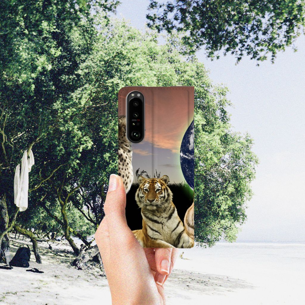 Deze standcase met roofdieren kan exclusief in het bezit van jou komen. Bovendien kun je hier zelf nog unieke teksten en/of beelden aan toevoegen. Je Hoesje maken krijgt dan een unieke identiteit. Roofdieren zoals tijgers op dit hoesje zijn voortdurend op zoek naar een geschikte prooi. De tijgers met aardbol op de achtergrond op deze stand case geven jouw Sony Xperia 5 III een hele stoere uitstraling. Deze bijzondere case is van PU-leer (buitenzijde) en TPU (binnenzijde) en beschikt over een houder en een speciale standaard. Verder is deze stand case met roofdieren voorzien van een magnetische sluiting aan de binnenzijde. Je zorgt voor de perfecte bescherming van je smartphone met dit design hoesje met roofdieren met aardbol op de achtergrond.
