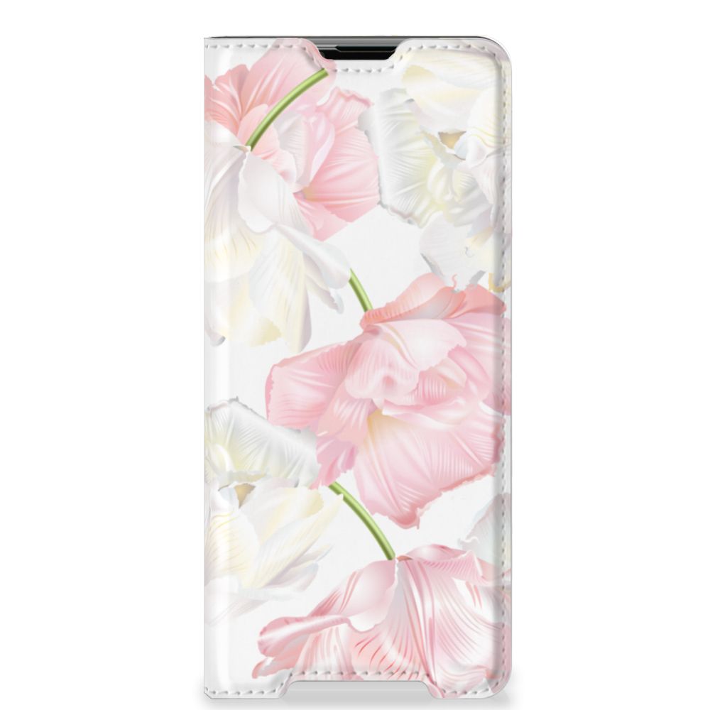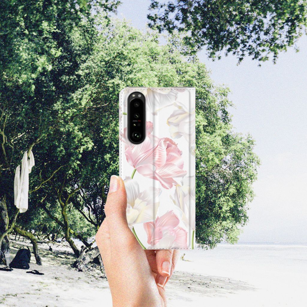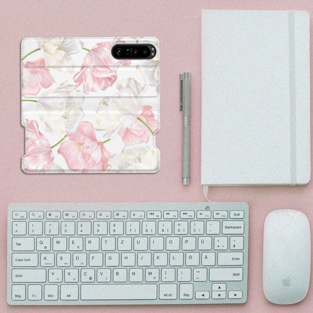 Een bosje bloemen doet een mens (en zijn smartphone) goed. De witte en roze bloemen op dit Sony Xperia 5 III Smart Cover geven jouw smartphone een zeer mooie uitstraling. Je wordt er ook meteen een stuk rustiger van als je aan het appen of aan het bellen bent. Valt dan je telefoon op de grond, dan zal er dankzij de stand case met het design Lovely Flowers ontstaan. Onze stand cases met roze en witte bloemen zien er zeer prettig uit en zijn heel praktisch, wat blijkt uit onder meer het vakje aan de binnenkant en de handige standaard waarmee je de smartphone rechtop op tafel neer kunt zetten. De roze en witte bloemen passen goed op alle zijden van de case. Op deze stand case van leer en TPU (houder aan de binnenkant) kun je trouwens ook je eigen bloemige ontwerp zetten. In een paar simpele stappen maak je zelf een stand hoesje met daarop jouw mooiste bloemen.