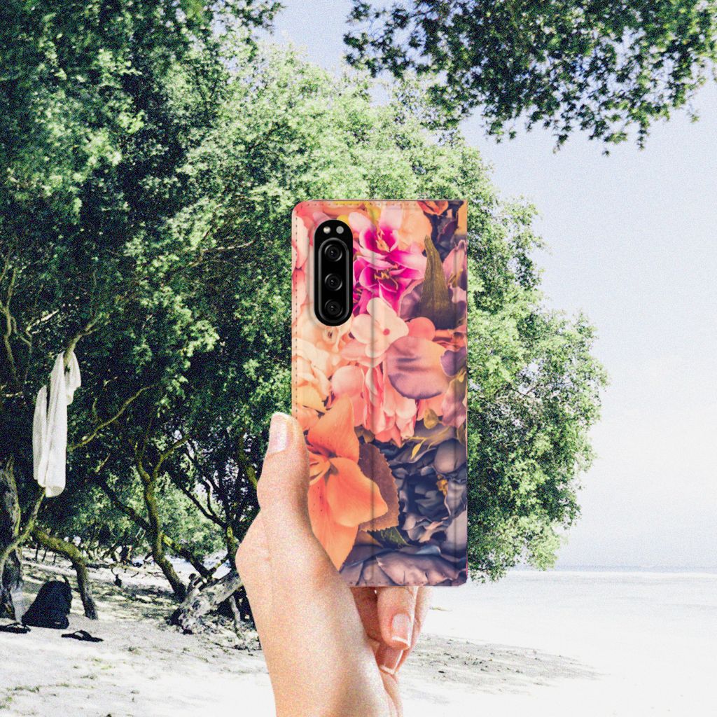 Dit Bosje Bloemen doet een mens en zijn smartphone goed. De oranje, paarse en roze bloemen op deze Sony Xperia 5 Smart Cover geven jouw smartphone een zeer sierlijke uitstraling. Je wordt er ook meteen vrolijker van als je aan het appen, mailen of aan het bellen bent. Valt dan je telefoon op de grond, dan zal er dankzij de stand case met oranje, paarse en roze bloemen geen schade ontstaan. Onze stand cases met oranje, paarse en roze bloemen bieden de allerbeste bescherming en zijn heel praktisch, wat blijkt uit onder meer het vakje aan de binnenkant en de handige standaard waarmee je de smartphone rechtop op tafel neer kunt zetten. De oranje, paarse en roze bloemen passen goed op alle zijden van de case. Op deze stand case van leer en TPU (houder aan de binnenkant) is het ook mogelijk je eigen ontwerp te zetten. In no time maak je zelf een stand case met daarop foto’s van jouw favoriete bloemen.