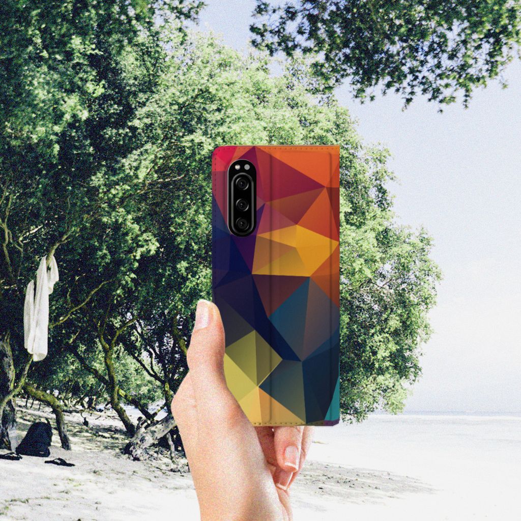 Veelkleurige driehoeken die samen eindeloze asymmetrische patronen lijken te vormen. Het is het abstracte schouwspel dat op dit fraaie hoesje voor je Sony Xperia 5 direct de aandacht trekt noemen we voor het gemak trekt noemen we voor het gemak Polygon Color. De een ziet er een berglandschap in, de ander piramides. Wat zie jij erin? Zeker is in elk geval dat de aanblik van dit fascinerende ontwerp je niet snel gaat vervelen. Het kleurige spel van lijnen en vlakken blijft eindeloos boeien en geeft jouw Stand Case een hippe en kunstzinnige uitstraling. De kracht die het lijnenspel uitstraalt, komt ook terug in het hoesje zelf. De solide hoes van PU-leer beschikt ook over een 1 pashouder en een speciale standaard. Het hoesje wordt afgesloten met een magneet aan de binnenzijde. De houder aan de binnenzijde is van TPU. Alle zijden worden bedrukt.