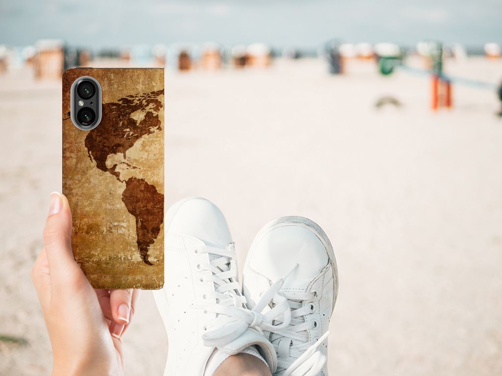 Als je een hoesje koopt met een wereldkaart, kun jij op veilige wijze met je smartphone rond de wereld reizen. Ga je zonder een boekhoesje met wereldkaart het buitenland verkennen, dan loop je veel te groot risico dat je stukken krijgt aan je smartphone. Met als gevolg dat je de belangrijke gebeurtenissen op je reis wellicht niet meer vast kunt leggen om door te sturen aan je vrienden. In het slechtste geval wordt jouw toestel zonder een smartphone hoesje met wereldkaart onbruikbaar. Wij kunnen de wereldkaart bedrukken op een stand case. Een Sony Xperia 5 V Book Cover beschermt jouw telefoon aan alle kanten en beschikt over een 1 opbergvakje en een speciale standaard. Het hoesje wordt afgesloten met een magneet aan de binnenzijde. De houder aan de binnenzijde is van TPU. Dit stand hoesje met wereldkaart is voor een zeer laag bedrag te bestellen.