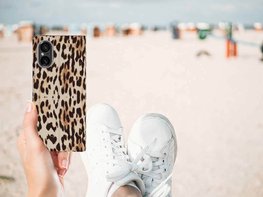 Het luipaard wordt ook wel een panter genoemd en is een sluwe kat. De bruingele vacht met een patroon van rozetachtige vlekken geeft een goede schutkleur. Dit zie je ook op een fraaie manier afgebeeld op dit super stoere hoesje met luipaardprint. Mensen die indruk willen maken kopen deze stand case met Leopard print. Een Sony Xperia 5 V Hoesje maken is van alle markten thuis. Het is praktisch â vanwege onder meer het opbergvakje en de magnetische sluiting aan de binnenzijde â maar beschermt jouw smartphone tevens op een geweldige manier. Het luipaard is sterk en behendig en wellicht typeert jou dat ook wel. Dan past dit hoesje met luipaard perfect bij jou. De houder van TPU aan de binnenzijde is minstens zo sterk als het luipaard. Jouw telefoon is perfect beschermd en de case heeft tevens een standaard.