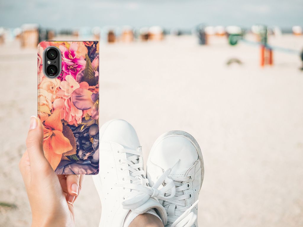 Dit Bosje Bloemen doet een mens en zijn smartphone goed. De oranje, paarse en roze bloemen op deze Sony Xperia 5 V Smart Cover geven jouw smartphone een zeer sierlijke uitstraling. Je wordt er ook meteen vrolijker van als je aan het appen, mailen of aan het bellen bent. Valt dan je telefoon op de grond, dan zal er dankzij de stand case met oranje, paarse en roze bloemen geen schade ontstaan. Onze stand cases met oranje, paarse en roze bloemen bieden de allerbeste bescherming en zijn heel praktisch, wat blijkt uit onder meer het vakje aan de binnenkant en de handige standaard waarmee je de smartphone rechtop op tafel neer kunt zetten. De oranje, paarse en roze bloemen passen goed op alle zijden van de case. Op deze stand case van leer en TPU (houder aan de binnenkant) is het ook mogelijk je eigen ontwerp te zetten. In no time maak je zelf een stand case met daarop foto’s van jouw favoriete bloemen.