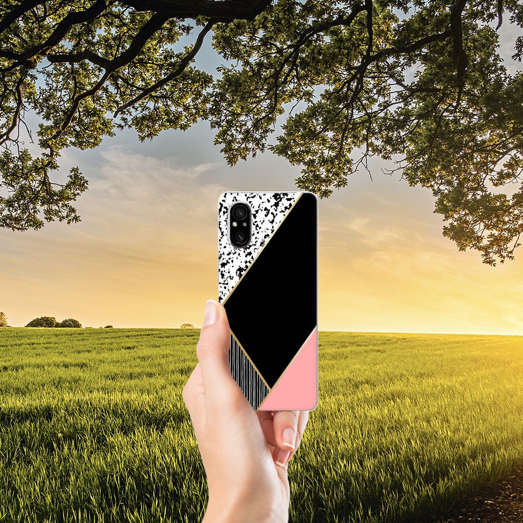 - Met een tpu-siliconen hoesje met roze, zwarte en witte vlakken blijft jouw telefoon in tact.