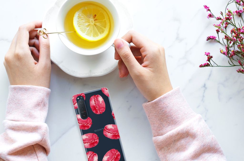 Dit tpu hoesje met Pink Macarons is een zeer opvallende bescherming voor jouw smartphone. Macarons zijn Franse koekjes: kleine, rond en luchtig. Ze worden in veel verschillende smaken gemaakt, herkenbaar aan de verschillende kleuren zoals chocolade (donkerbruin), mokka (middenbruin), kersen (rood), pistache (groen), aardbei (roze), framboos (karmijn). Deze kleuren kun je niet allemaal zien op dit fraaie design hoesje met roze macarons. Heb je altijd al een Sony Xperia 5II Siliconen Case willen hebben met roze macarons? Grijp dan nu je kans. Deze case heeft zeer veel goede eigenschappen, zoals elastisch vermogen, flexibiliteit en schokbestendigheid. Dit design hoesje met roze macarons wordt aan de bovenkant bedrukt, de zijkanten blijven doorzichtig. De case heeft opstaande randen aan de voorzijde en beschermt samen met een screenprotector jouw telefoon perfect. De case heeft ook een handige standaard.