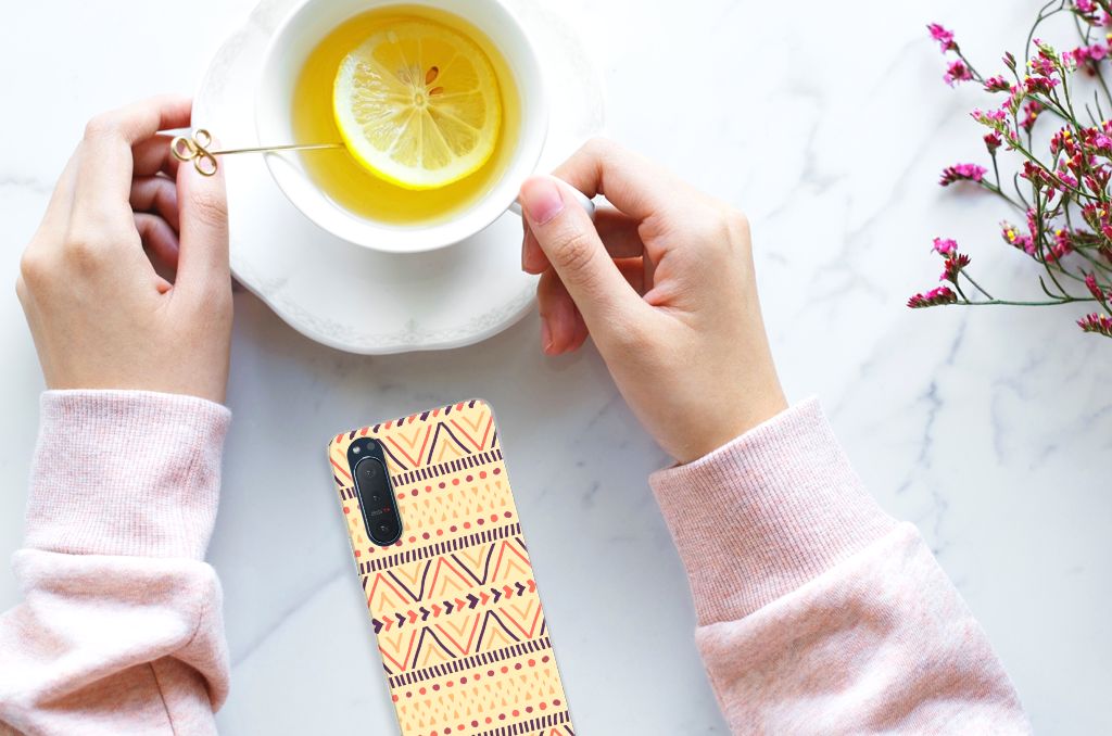 De Azteken leefden tussen 1200 en 1521 in het huidige Mexico. De mooie Aztec-patronen waar zij bekend om stonden, zien we nu nog op kleding, stoffen en tassen. Wie had toen kunnen bedenken dat we diezelfde prints honderden jaren later zelfs op een telefoonhoesje zouden vinden? Dit kleurrijke Aztec Yellow-hoesje is perfect voor iedereen die een stukje geschiedenis bij zich wil dragen maar ook gewoon een mooi patroon op zijn hoesje wil. Dit vrolijke, kleurrijke ontwerp staat op een TPU bumper voor de Sony Xperia 5II. TPU is flexibel en onbreekbaar. Zo is je telefoon aan de achterkant en de randen heel goed beschermd. De case is aan de bovenkant bedrukt, de randen blijven transparant.