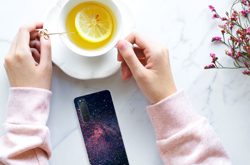 Je waant je in de zevende hemel met dit kunstzinnige, glitterachtige design hoesje met paarse en blauwe kleuren tegen een inktzwarte achtergrond. Het smartphone hoesje heeft ook een wat science fiction achtige allure. Met deze design Stars case zul je zeker opvallen. Als dit je bedoeling is, bestel dat snel dit waanzinnig mooie product voor je Sony Xperia 5II. Het telefoonhoesje is van alle gemakken voorzien en combineert een hele fraaie uitstraling met maximaal comfort. Bovendien is het gemaakt van zeer stevig en flexibel materiaal. Het unieke design, door B2C Telecom ontworpen, staat op een TPU Hoesje. Dit hoesje wordt alleen aan de bovenkant bedrukt en is zeer flexibel. De randen van het hoesje blijven transparant en worden niet bedrukt. Met dit hoesje past jouw telefoon altijd in je broekzak.