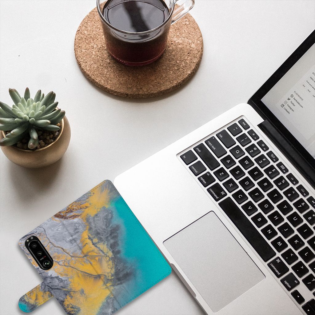 Dit Sony Xperia 5III Bookcase met Marble Blue Gold is het waard om een blokje voor om te fietsen. Dit is echter helemaal niet nodig. Als je het hoesje met marmer blauw met goud nu bestelt heb je het supersnel in huis. Je kunt er bij wijze van spreken voor de brievenbus op blijven wachten. Je hebt diverse marmersoorten in veel verschillende kleuren. We hebben enkele mooie kleuren op design hoesjes gezet, zoals in dit geval marmer blauw met goud. Het marmer wordt bedrukt op alle zijden van het boekhoesje, dat beschikt over vakjes voor pasjes en briefgeld en een magnetisch lipje aan de buitenzijde. Verder heeft de case met marmer blauw met goud een houder van TPU. De rijkheid aan kleuren en variaties in afwerking is een fraaie eigenschap van marmer. Dit boekhoesje met marmer blauw met goud heeft ook veel schitterende eigenschappen en is de ideale bescherming voor jouw smartphone.