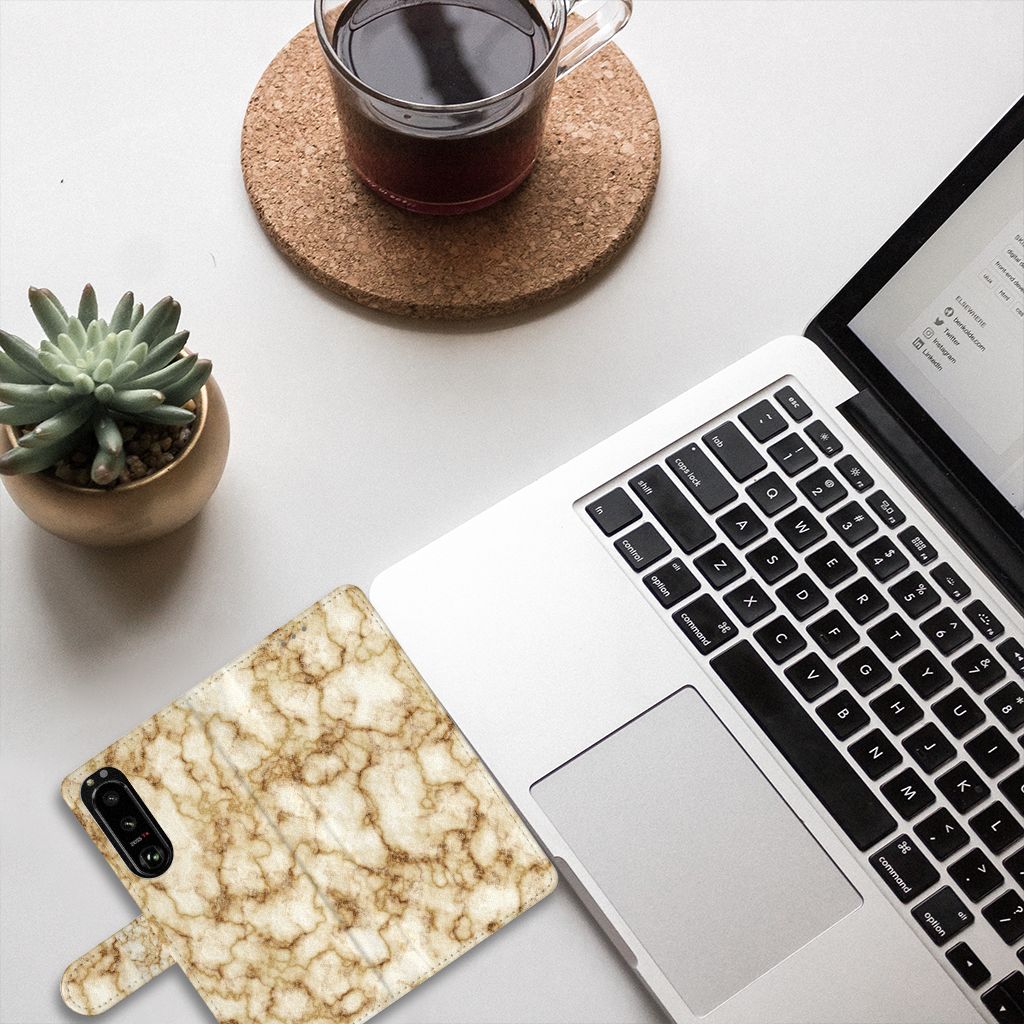 Dit Sony Xperia 5III Bookcase met Marmer Goud is het waard om een blokje voor om te rijden. Dit is overigens niet nodig. Als je het hoesje met goud marmer nu bestelt heb je het zeer snel in huis. Je kunt er bij wijze van spreken thuis op gaan zitten wachten. Je hebt diverse soorten marmer. We hebben enkele fraaie kleuren op onze hoesjes gezet, zoals in dit geval het gouden marmer. Het marmer wordt bedrukt op alle zijden van het boekhoesje, dat beschikt over vakjes voor pasjes en briefgeld en een magnetisch lipje aan de buitenzijde. Verder heeft de case met marmer met goud een houder van TPU. De rijkheid aan kleuren en varianties in afwerking is een fraaie eigenschap van marmer. Dit boekhoesje met marmer goud heeft ook veel schitterende eigenschappen en is de ideale bescherming voor jouw smartphone.