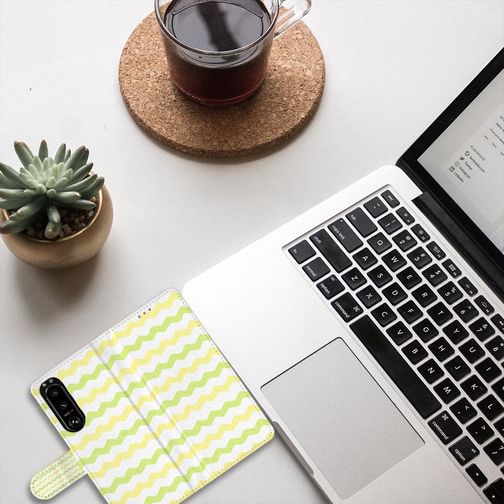 Dit Waves Yellow design hoesje met licht groene en gele golven is speciaal ontworpen voor jouw telefoon. We hebben een vleugje lichtgeel toegevoegd, zodat de case er een beetje spannender en leuker uitziet. Dit licht groene hoesje met licht groene golven ziet er oogstrelend uit. Het wordt in ons eigen magazijn bedrukt, in zeer goede kwaliteit inkt. Wij kunnen dus een zeer duurzaam hoesje met licht groene golven garanderen. Dit hele mooie Sony Xperia 5III Telefoon Hoesje heeft vele extra’s. Is dit licht groene design hoesje je op het lijf geschreven? Grijp dan nu je kans. Een boekhoesje met lichtgroene golven beschermt jouw telefoon aan alle zijden en beschikt over meerdere houders voor pasjes en briefgeld. De case sluit perfect af met het magnetisch lipje aan de buitenkant. De houder aan de binnenzijde is van het flexibele TPU. Alle zijden van het licht groene hoesje met golven worden bedrukt, inclusief het lipje.