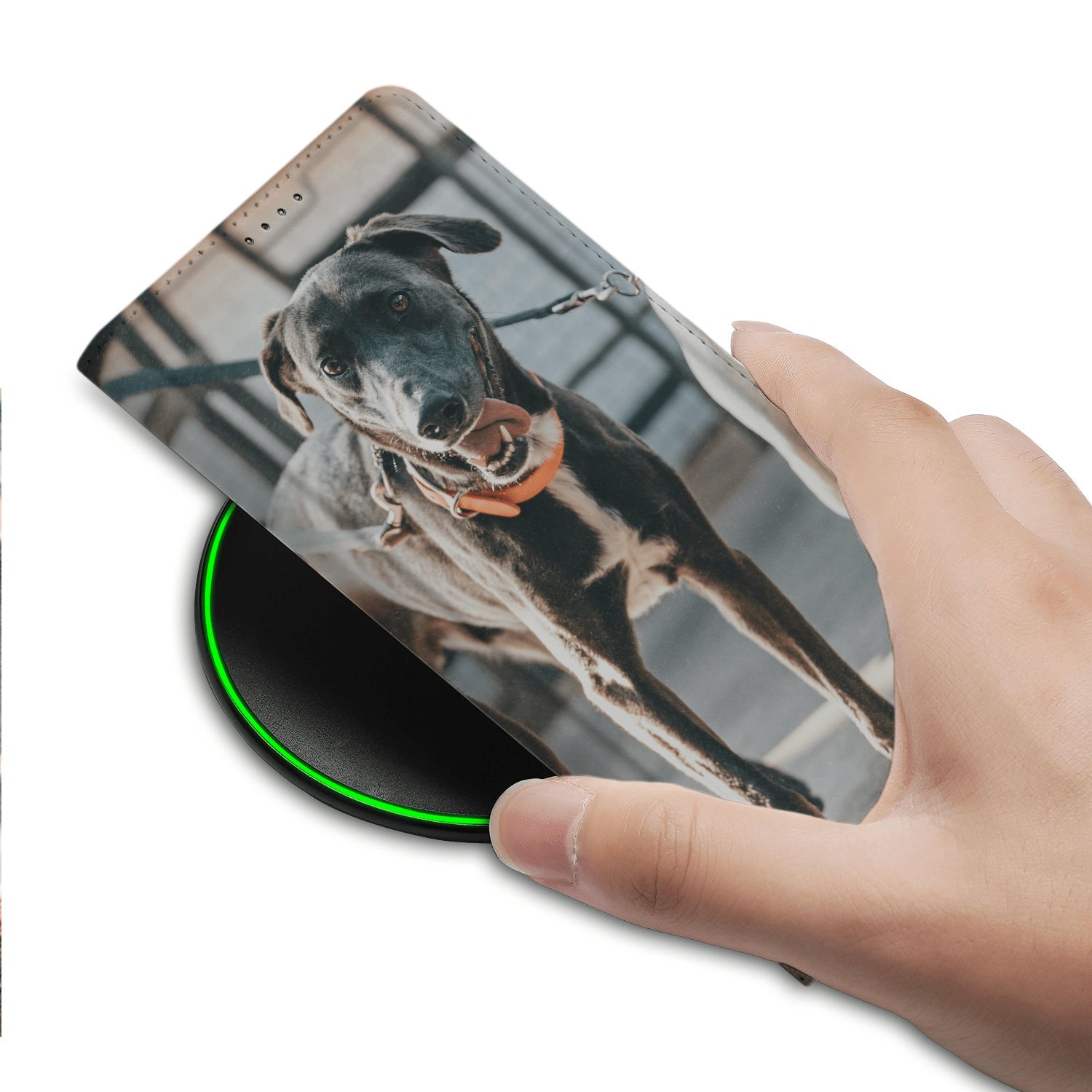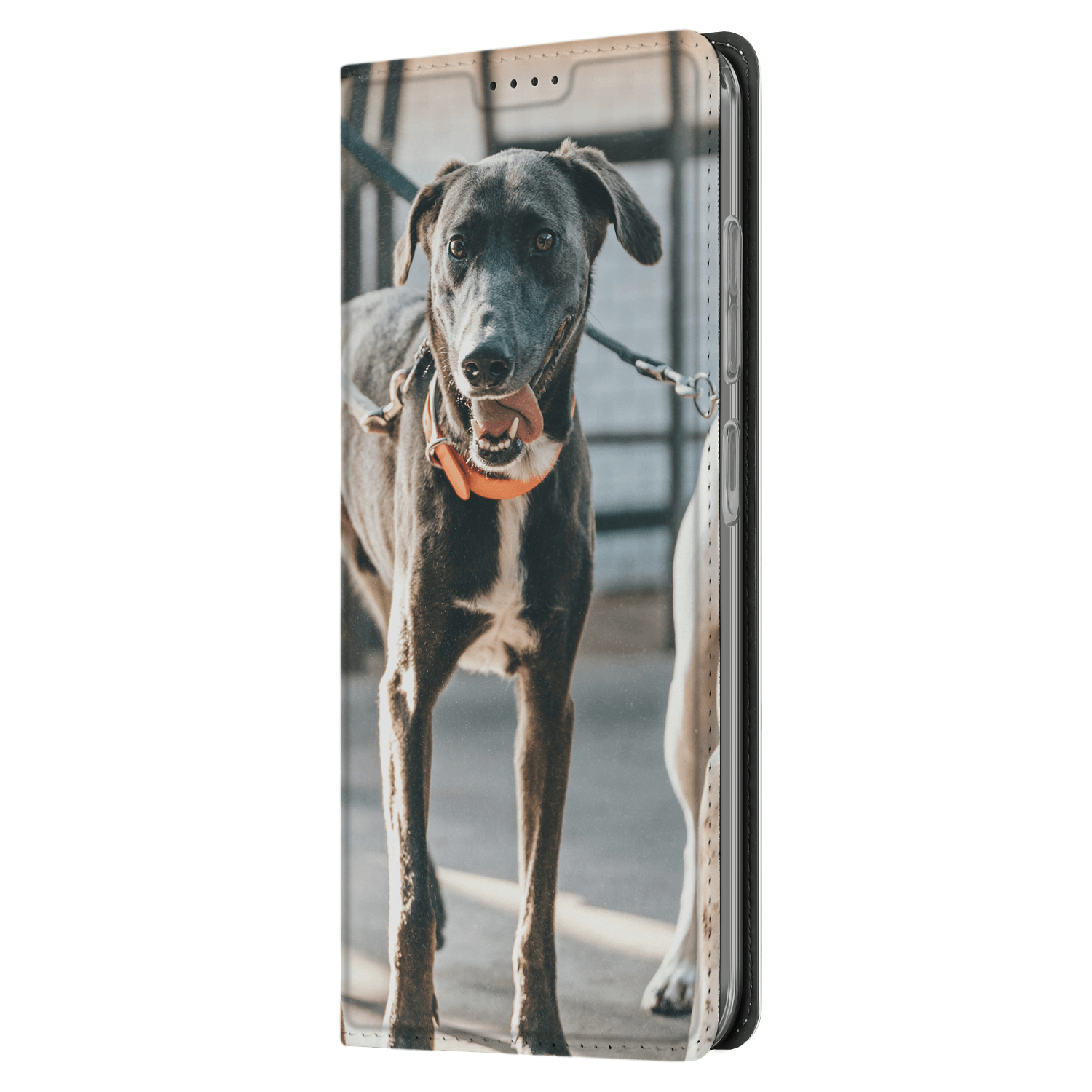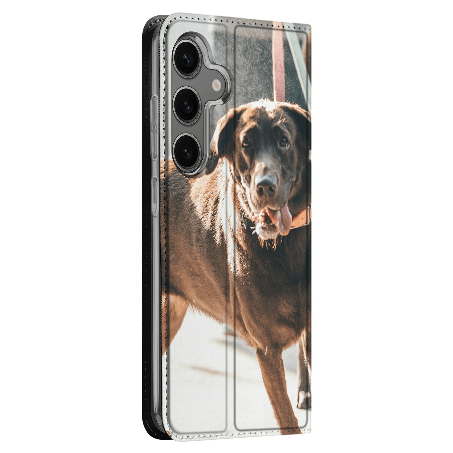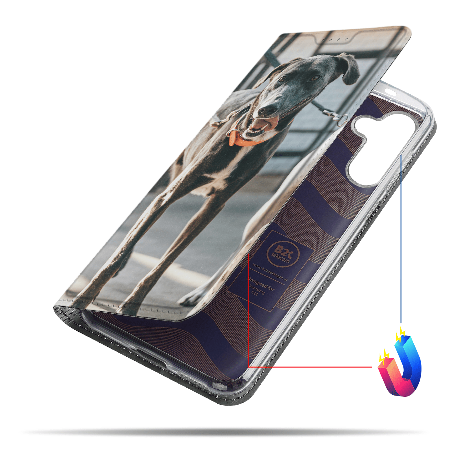 Stand Case Hoesje Maken voor de Samsung Galaxy S24. Ben je op zoek naar een originele en unieke bescherming voor je telefoon? Dan ben je bij B2C Telecom aan het juiste adres! Je kunt via onze website gemakkelijk een telefoonhoesje ontwerpen met foto's, tekst of bedrijfslogo. De mogelijkheden zijn eindeloos. Wees creatief en upload foto's of plaatjes van je kinderen, huisdieren, familie, hobby of favoriete voetbalclub. De foto's of plaatjes kun je in de gewenste grootte plaatsen of draaien voor een speels effect. Maak het hoesje persoonlijker door je naam of quote toe te voegen. Je kunt kiezen uit verschillende lettertypes; van strak tot vetgedrukt of ga je liever voor iets sierlijks? Het kan allemaal! De kers op de taart is natuurlijk de toevoeging van een glossy-effect! Kies uit verschillende effecten en jouw hoesje wordt subtiel bedrukt met een glossy-effect. Kortom, wij bieden verschillende mogelijkheden om jouw hoesje zo persoonlijk en uniek mogelijk te maken! Jouw ontwerp wordt bedrukt op een wit hoesje gemaakt van kunstleer. De binnenkant van het hoesje is donkergrijs en heeft één vakje voor een pasje. De houder waar je je telefoon in vast zet, is gemaakt van transparante TPU. Door de magneten aan de binnenkant, blijft het hoesje stevig dicht. Een ander voordeel is dat het hoesje een stand-case functie heeft voor als je graag filmpjes kijkt op je telefoon. Overtuigd? Ontwerp dan vandaag nog je eigen telefoonhoesje en ontvang jouw ontwerp binnen een aantal werkdagen in huis!