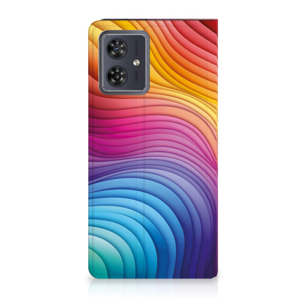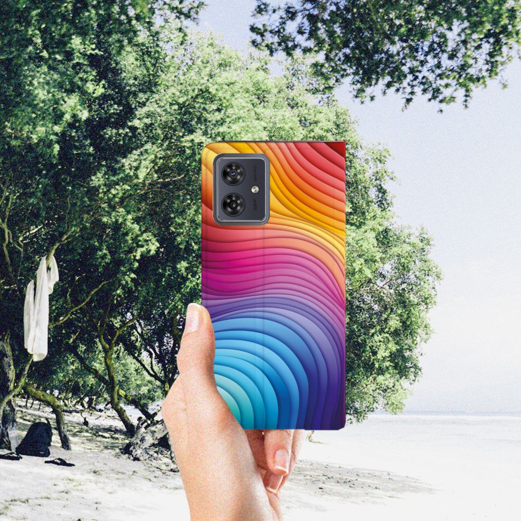 Een regenboog bestaat eigenlijk uit meer dan zeven kleuren, wist je dat? De zichtbare kleuren vloeien geleidelijk in elkaar over, waardoor er eigenlijk meer dan zeven kleuren zijn. Dat wij maar zeven ‘’stroken’’ licht zien, is dus eigenlijk gezichtsbedrog. Toch noemen wij dit hoesje regenboog, omdat wij er blij van worden! Dit design wordt geprint op een Stand Case speciaal op maat gemaakt voor de Motorola Moto G54. In dit hoesje kun je een pasje kwijt, super fijn toch? Vouw het hoesje om en zet het horizontaal neer voor als je graag filmpjes op je Motorola Moto G54 kijkt. De magneten aan de binnenkant zorgen ervoor dat het hoesje dicht blijft in bijv. je tas. Bescherm jouw smartphone vandaag nog met dit toffe regenboog hoesje!
