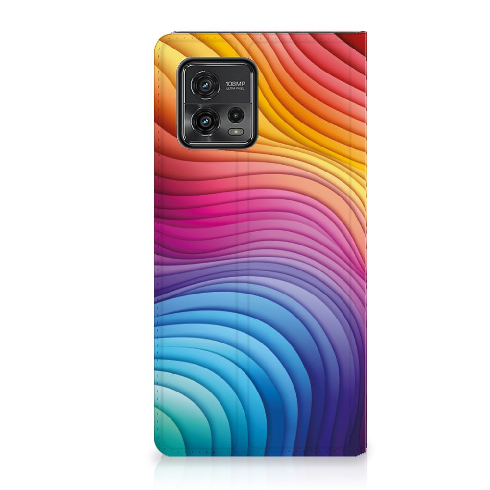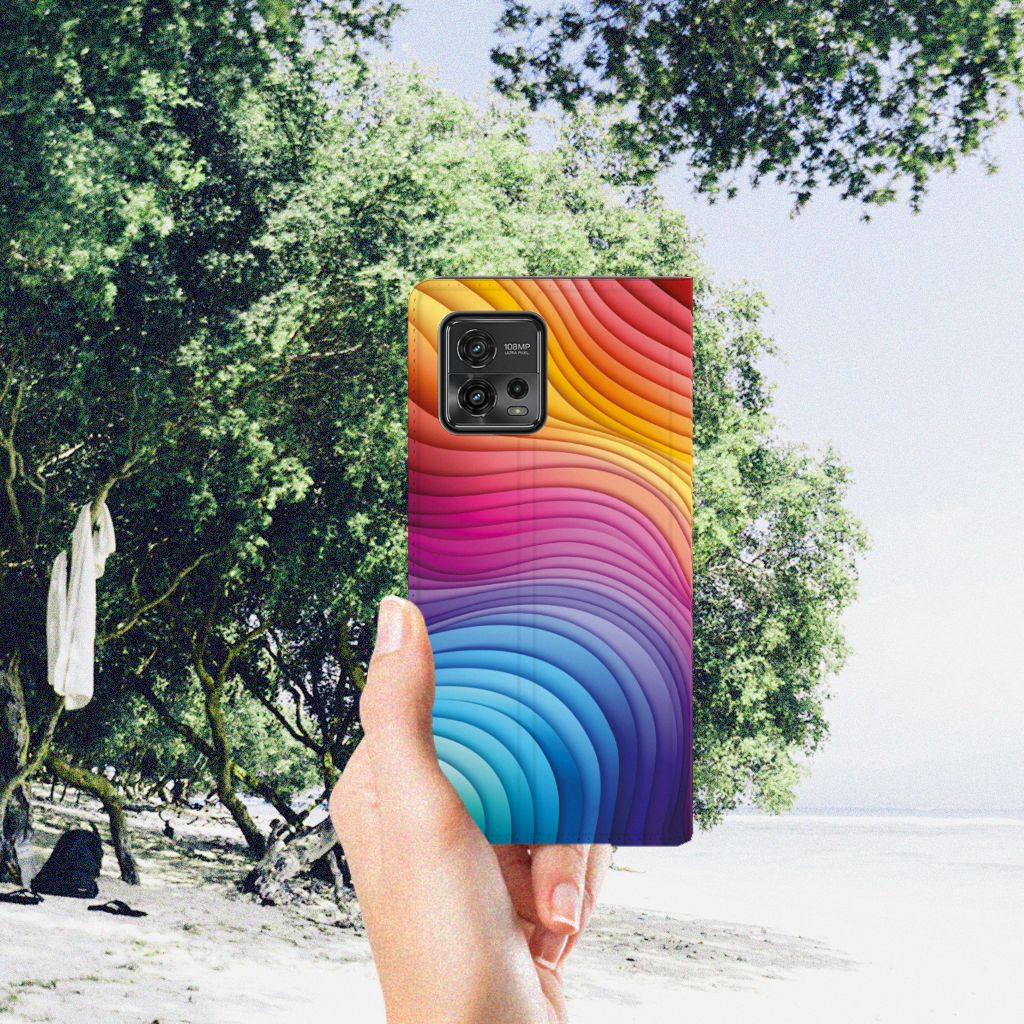 Een regenboog bestaat eigenlijk uit meer dan zeven kleuren, wist je dat? De zichtbare kleuren vloeien geleidelijk in elkaar over, waardoor er eigenlijk meer dan zeven kleuren zijn. Dat wij maar zeven ‘’stroken’’ licht zien, is dus eigenlijk gezichtsbedrog. Toch noemen wij dit hoesje regenboog, omdat wij er blij van worden! Dit design wordt geprint op een Stand Case speciaal op maat gemaakt voor de Motorola Moto G72. In dit hoesje kun je een pasje kwijt, super fijn toch? Vouw het hoesje om en zet het horizontaal neer voor als je graag filmpjes op je Motorola Moto G72 kijkt. De magneten aan de binnenkant zorgen ervoor dat het hoesje dicht blijft in bijv. je tas. Bescherm jouw smartphone vandaag nog met dit toffe regenboog hoesje!