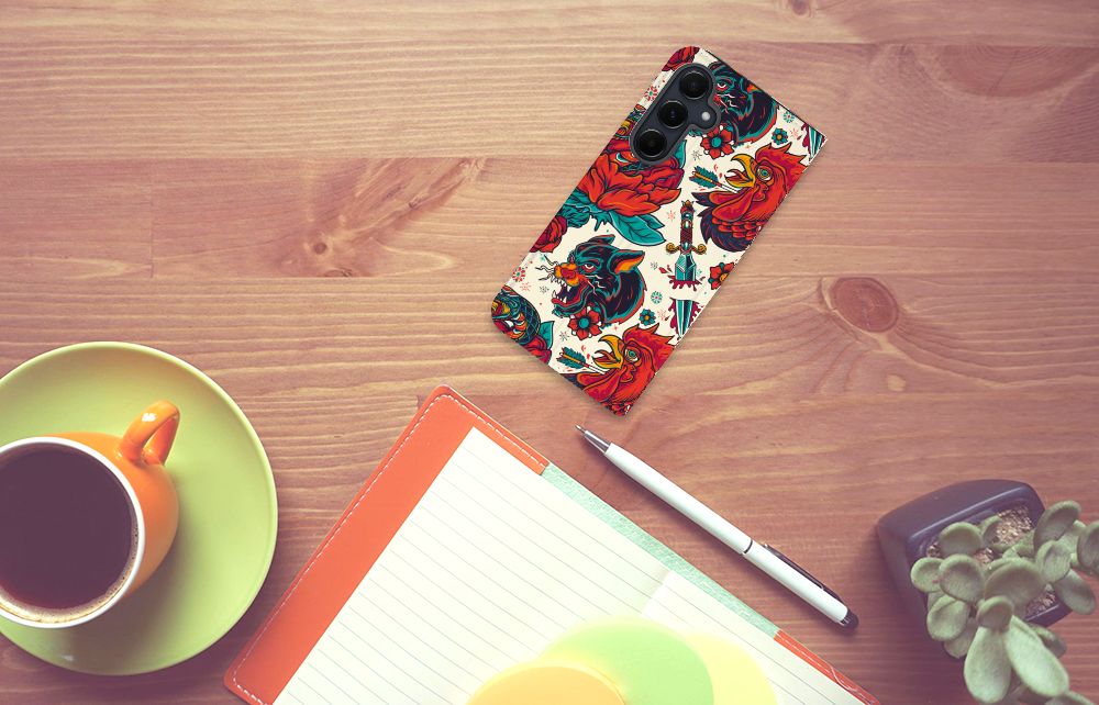 Ben je op zoek naar een stoer hoesje voor je Samsung Galaxy A55? Dan is dit hoesje in old skool stijl zeker iets voor jou! Het heeft wel iets weg van een tatoeage, vind je ook niet? Dit old skool vintage design wordt geprint op een Stand Case waarin je een pasje kwijt kunt. Vouw het hoesje om en zet het horizontaal neer voor als je graag filmpjes op je Samsung Galaxy A55 kijkt. De magneten aan de binnenkant zorgen ervoor dat het hoesje dicht blijft in bijv. je tas. Bescherm jouw smartphone vandaag nog met dit stoere old skool design hoesje!