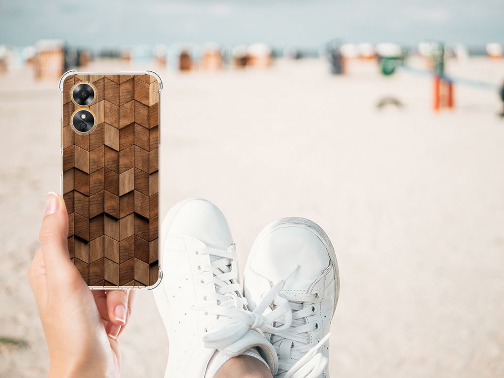 Onze houten hoesjes, niet letterlijk natuurlijk, maar onze design hoesjes met een bedrukking van houtprint zijn erg populair. Daarom werd het tijd voor een uitbreiding van onze collectie houten hoesjes. Hoe tof is dit wooden cubes design? Gegarandeerd dat jij met een uniek hoesje rond loopt! Dit design wordt geprint op een Stevig Telefoonhoesje speciaal op maat gemaakt voor de OPPO A17. Ook fijn zijn de extra dikke hoeken en randen, waardoor je smartphone goed beschermd is bij een val. Alleen de achterkant van je telefoon wordt beschermd. Daarom adviseren wij om dit hoesje in combinatie met een screenprotector te gebruiken. Bestel vandaag nog dit telefoonhoesje met toffe wooden cubes design!