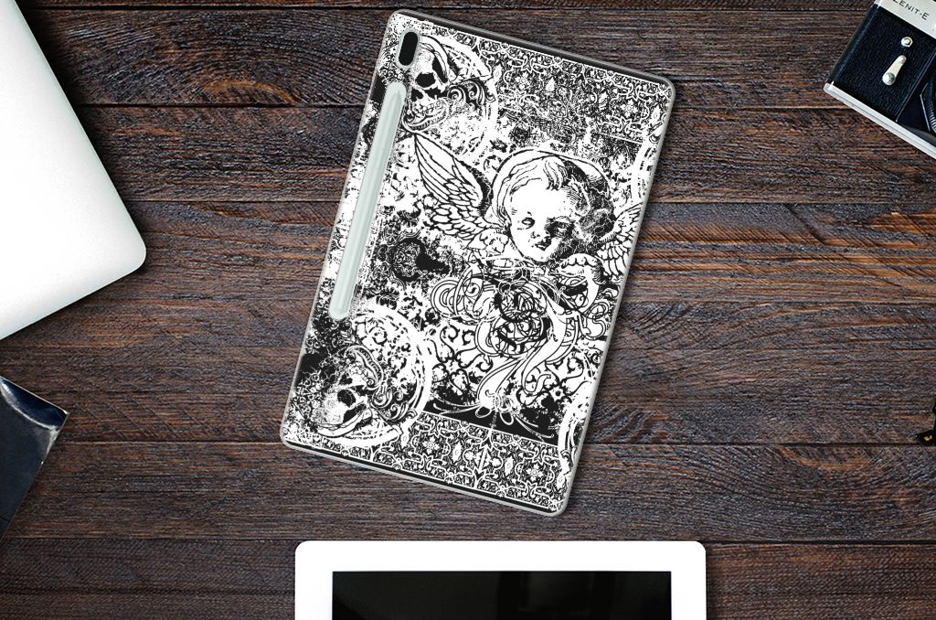 Dit mysterieuze patroon tref je vaak aan op een bandana. Een bandana is een kledingstuk dat om het hoofd of de hals wordt gedragen. Behalve als kledingstuk vindt de bandana soms toepassing als signaal. Een bandana is het eenvoudigste middel als je op de motor of de brommer zit en jezelf wilt beschermen tegen wind, opwaaiend stof of fijn zand. Leden van bekende motorclubs dragen dit kledingstuk dan ook graag, om meerdere redenen. Wil je jouw Samsung Galaxy Tab S7FE optimaal beschermen tegen opwaaiend stof, zand of andere bedreigingen, dan is dit design hoesje met Skulls Angel een zeer goede keus. Het design staat op een tablethoesje van TPU. Dit Tablet BackCover wordt alleen aan de bovenkant bedrukt en is zeer flexibel. De randen van het hoesje blijven transparant en worden niet bedrukt. Met dit hoesje past jouw tablet altijd in je tas.