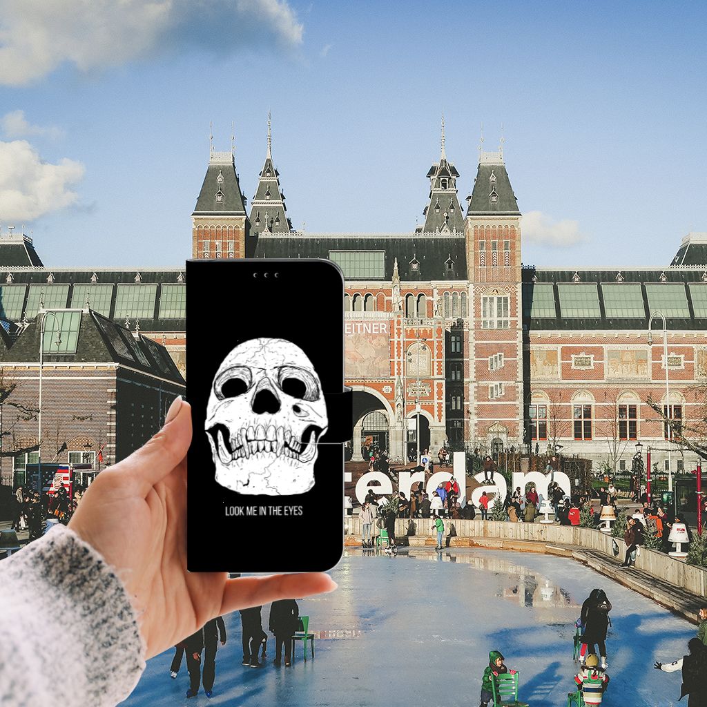 Ben je op zoek naar een uniek telefoonhoesje voor je Apple iPhone 11 Pro Max? Dan ben je bij B2C Telecom aan het juiste adres! Speciaal voor jou hebben we dit prachtige Skull Eyes design in onze collectie hoesjes opgenomen. Het design wordt bedrukt op een Telefoonhoesje met Naam en heeft twee vakjes voor pasjes en een groter vakje voor briefgeld. Alle zijdes van het hoesje worden bedrukt, hoe uniek is dat? Het hoesje wordt afgesloten met een sluit lipje aan de voorkant. Wil je dit design hoesje nog iets extra's geven? Voeg dan gratis je naam of een quote toe! Is dit design hoesje toch niet helemaal wat je zocht? Ontwerp dan zelf een hoesje in ons ontwerpprogramma.