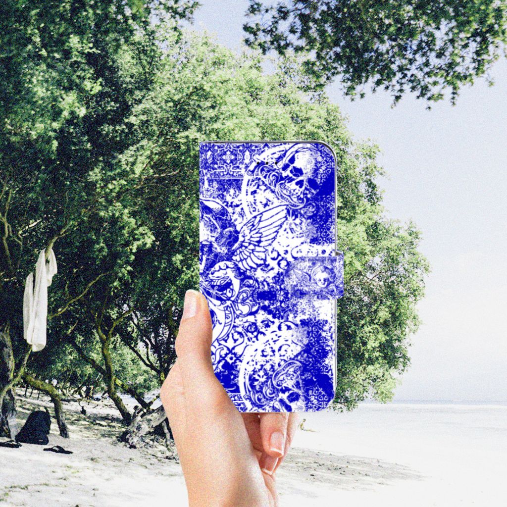Dit ietwat duistere blauwe patroon tref je vaak aan op een bandana. Een bandana wordt om het hoofd of de hals gedragen. Een bandana is ideaal als je op de racefiets, motor of de brommer zit en jezelf wilt beschermen tegen wind, opwaaiend stof of fijn zand. Leden van motorclubs dragen dit soort bandana’s dan ook graag. Wil je jouw Apple iPhone 7 Plus | 8 Plus optimaal beschermen tegen opwaaiend stof, zand of andere bedreigingen, dan is dit design hoesje met Angel Skull Blue design een zeer goede keus. Het design staat op een Telefoonhoesje met Naam. Dit smartphonehoesje beschermt jouw telefoon aan alle zijden en beschikt over verschillende opbergvakjes voor pasjes en briefgeld. De case sluit perfect af met het lipje aan de buitenkant. De houder aan de binnenzijde is van TPU. Alle zijden van het hoesje worden bedrukt, inclusief het lipje