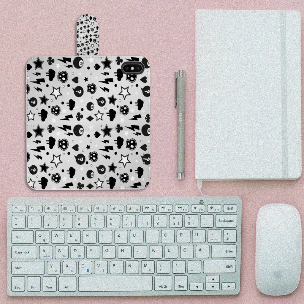 Bliksemflitsen, donderwolken, sterren en biljartballen vliegen op je af als je dit Apple iPhone X | Xs Telefoonhoesje met Naam koopt. Het bijzondere Silver Punk design is van onze eigen ontwerper en vind je in geen enkel andere winkel of webshop. Ben je fan van dit soort stoere en opvallende hoesjes, dan kun je je geluk niet op als je ons assortiment smartphone accessoires bekijkt. Het design op dit zeer populaire boekhoesje bedrukken we zelf in ons eigen magazijn. De case heeft verschillende vakjes en is aan alle zijden bedrukt met bliksemflitsen, donderwolken, sterren en biljartballen. Ook het magnetisch lipje aan de buitenkant heeft een print. De houder binnen in het hoesje is van TPU, de buitenzijde van PU-leer. Zelfs doodshoofdjes zie je voorbijkomen in het design. Om maar aan te geven dat je met dit zilveren hoesje een krachtige smartphone accessoire te pakken hebt.