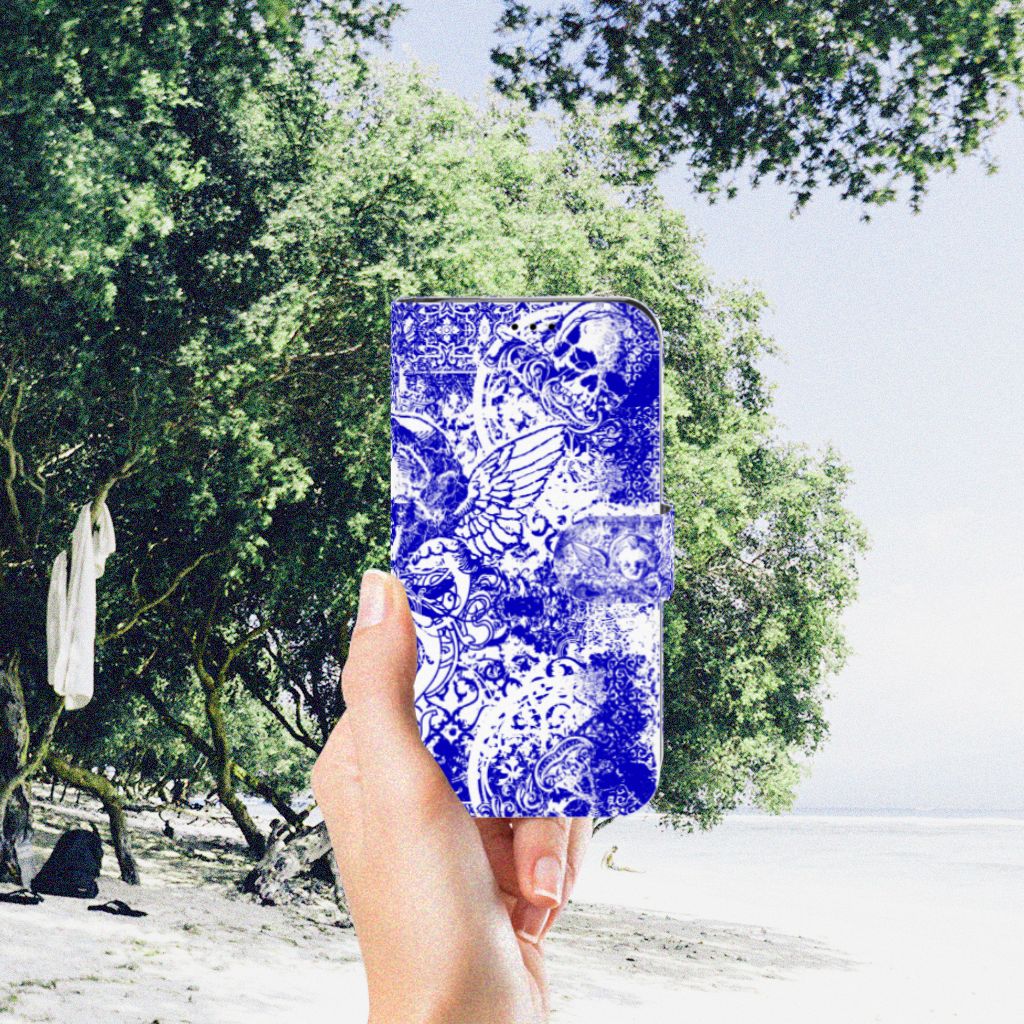 Dit ietwat duistere blauwe patroon tref je vaak aan op een bandana. Een bandana wordt om het hoofd of de hals gedragen. Een bandana is ideaal als je op de racefiets, motor of de brommer zit en jezelf wilt beschermen tegen wind, opwaaiend stof of fijn zand. Leden van motorclubs dragen dit soort bandana’s dan ook graag. Wil je jouw Apple iPhone Xr optimaal beschermen tegen opwaaiend stof, zand of andere bedreigingen, dan is dit design hoesje met Angel Skull Blue design een zeer goede keus. Het design staat op een Telefoonhoesje met Naam. Dit smartphonehoesje beschermt jouw telefoon aan alle zijden en beschikt over verschillende opbergvakjes voor pasjes en briefgeld. De case sluit perfect af met het lipje aan de buitenkant. De houder aan de binnenzijde is van TPU. Alle zijden van het hoesje worden bedrukt, inclusief het lipje