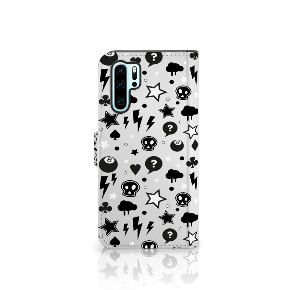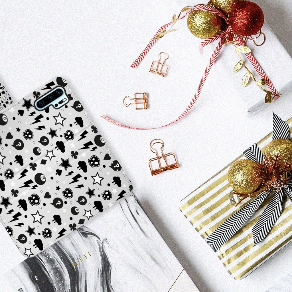 Bliksemflitsen, donderwolken, sterren en biljartballen vliegen op je af als je dit Huawei P30 Pro Telefoonhoesje met Naam koopt. Het bijzondere Silver Punk design is van onze eigen ontwerper en vind je in geen enkel andere winkel of webshop. Ben je fan van dit soort stoere en opvallende hoesjes, dan kun je je geluk niet op als je ons assortiment smartphone accessoires bekijkt. Het design op dit zeer populaire boekhoesje bedrukken we zelf in ons eigen magazijn. De case heeft verschillende vakjes en is aan alle zijden bedrukt met bliksemflitsen, donderwolken, sterren en biljartballen. Ook het magnetisch lipje aan de buitenkant heeft een print. De houder binnen in het hoesje is van TPU, de buitenzijde van PU-leer. Zelfs doodshoofdjes zie je voorbijkomen in het design. Om maar aan te geven dat je met dit zilveren hoesje een krachtige smartphone accessoire te pakken hebt.