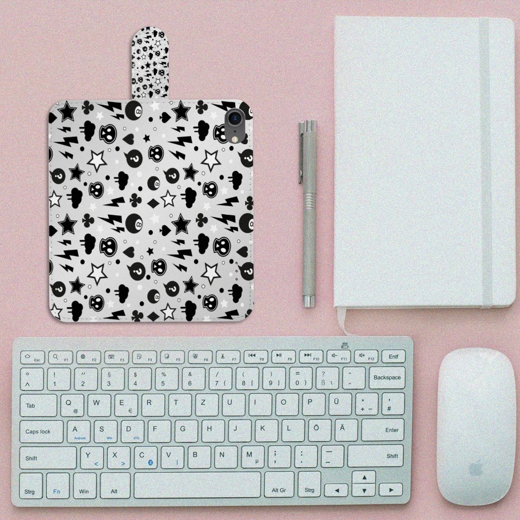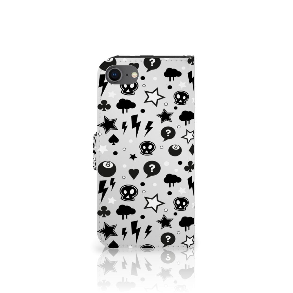 Bliksemflitsen, donderwolken, sterren en biljartballen vliegen op je af als je dit iPhone 7 | 8 | SE (2020) | SE (2022) Telefoonhoesje met Naam koopt. Het bijzondere Silver Punk design is van onze eigen ontwerper en vind je in geen enkel andere winkel of webshop. Ben je fan van dit soort stoere en opvallende hoesjes, dan kun je je geluk niet op als je ons assortiment smartphone accessoires bekijkt. Het design op dit zeer populaire boekhoesje bedrukken we zelf in ons eigen magazijn. De case heeft verschillende vakjes en is aan alle zijden bedrukt met bliksemflitsen, donderwolken, sterren en biljartballen. Ook het magnetisch lipje aan de buitenkant heeft een print. De houder binnen in het hoesje is van TPU, de buitenzijde van PU-leer. Zelfs doodshoofdjes zie je voorbijkomen in het design. Om maar aan te geven dat je met dit zilveren hoesje een krachtige smartphone accessoire te pakken hebt.