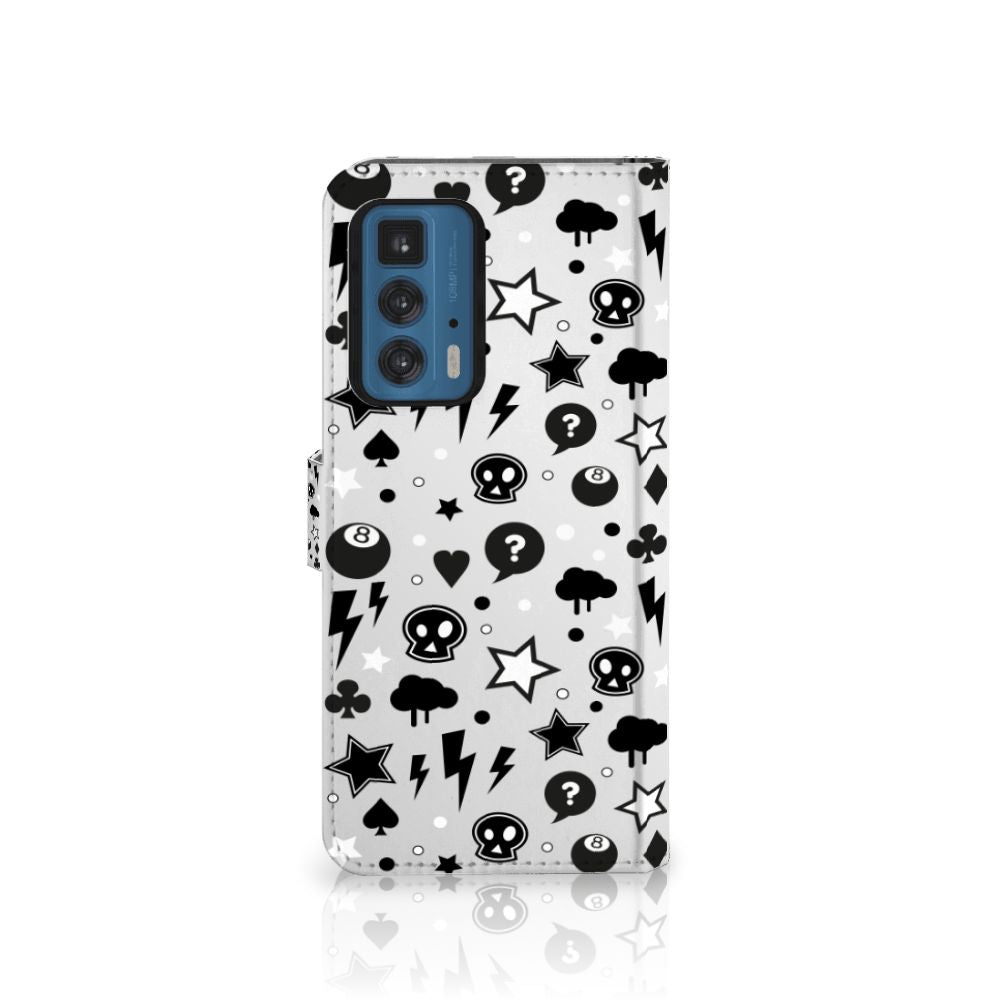 Bliksemflitsen, donderwolken, sterren en biljartballen vliegen op je af als je dit Motorola Edge 20 Pro Telefoonhoesje met Naam koopt. Het bijzondere Silver Punk design is van onze eigen ontwerper en vind je in geen enkel andere winkel of webshop. Ben je fan van dit soort stoere en opvallende hoesjes, dan kun je je geluk niet op als je ons assortiment smartphone accessoires bekijkt. Het design op dit zeer populaire boekhoesje bedrukken we zelf in ons eigen magazijn. De case heeft verschillende vakjes en is aan alle zijden bedrukt met bliksemflitsen, donderwolken, sterren en biljartballen. Ook het magnetisch lipje aan de buitenkant heeft een print. De houder binnen in het hoesje is van TPU, de buitenzijde van PU-leer. Zelfs doodshoofdjes zie je voorbijkomen in het design. Om maar aan te geven dat je met dit zilveren hoesje een krachtige smartphone accessoire te pakken hebt.