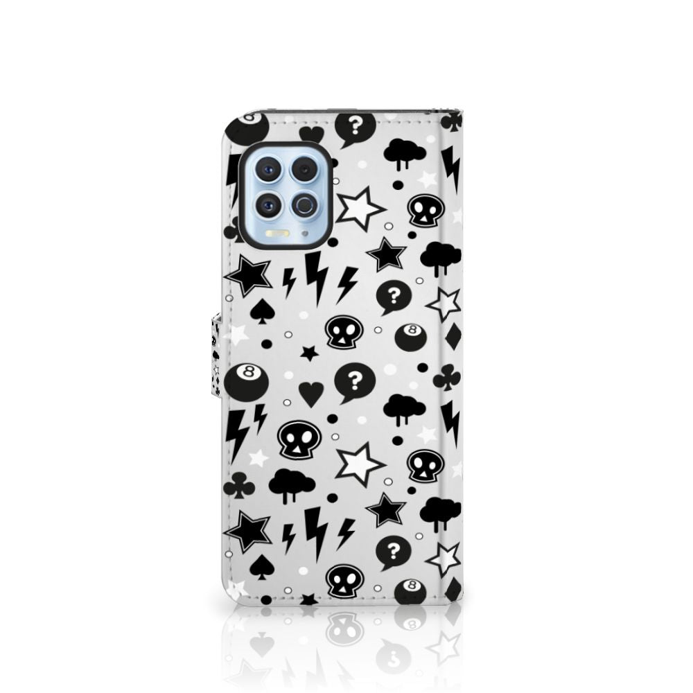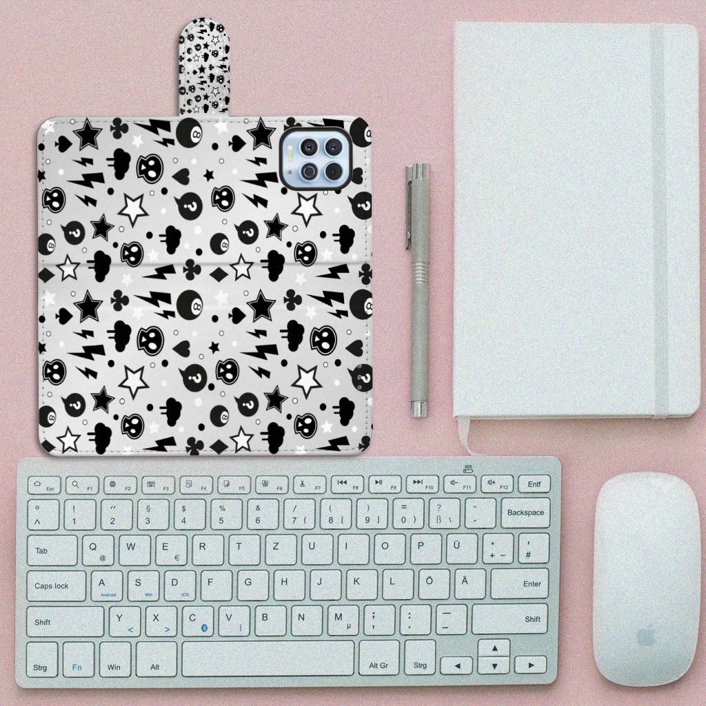 Bliksemflitsen, donderwolken, sterren en biljartballen vliegen op je af als je dit Motorola Moto G100 Telefoonhoesje met Naam koopt. Het bijzondere Silver Punk design is van onze eigen ontwerper en vind je in geen enkel andere winkel of webshop. Ben je fan van dit soort stoere en opvallende hoesjes, dan kun je je geluk niet op als je ons assortiment smartphone accessoires bekijkt. Het design op dit zeer populaire boekhoesje bedrukken we zelf in ons eigen magazijn. De case heeft verschillende vakjes en is aan alle zijden bedrukt met bliksemflitsen, donderwolken, sterren en biljartballen. Ook het magnetisch lipje aan de buitenkant heeft een print. De houder binnen in het hoesje is van TPU, de buitenzijde van PU-leer. Zelfs doodshoofdjes zie je voorbijkomen in het design. Om maar aan te geven dat je met dit zilveren hoesje een krachtige smartphone accessoire te pakken hebt.