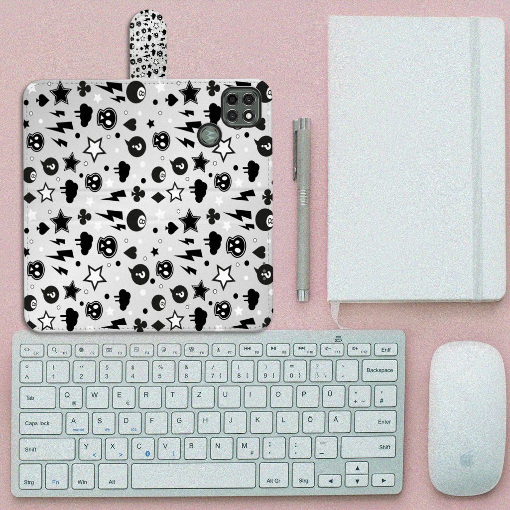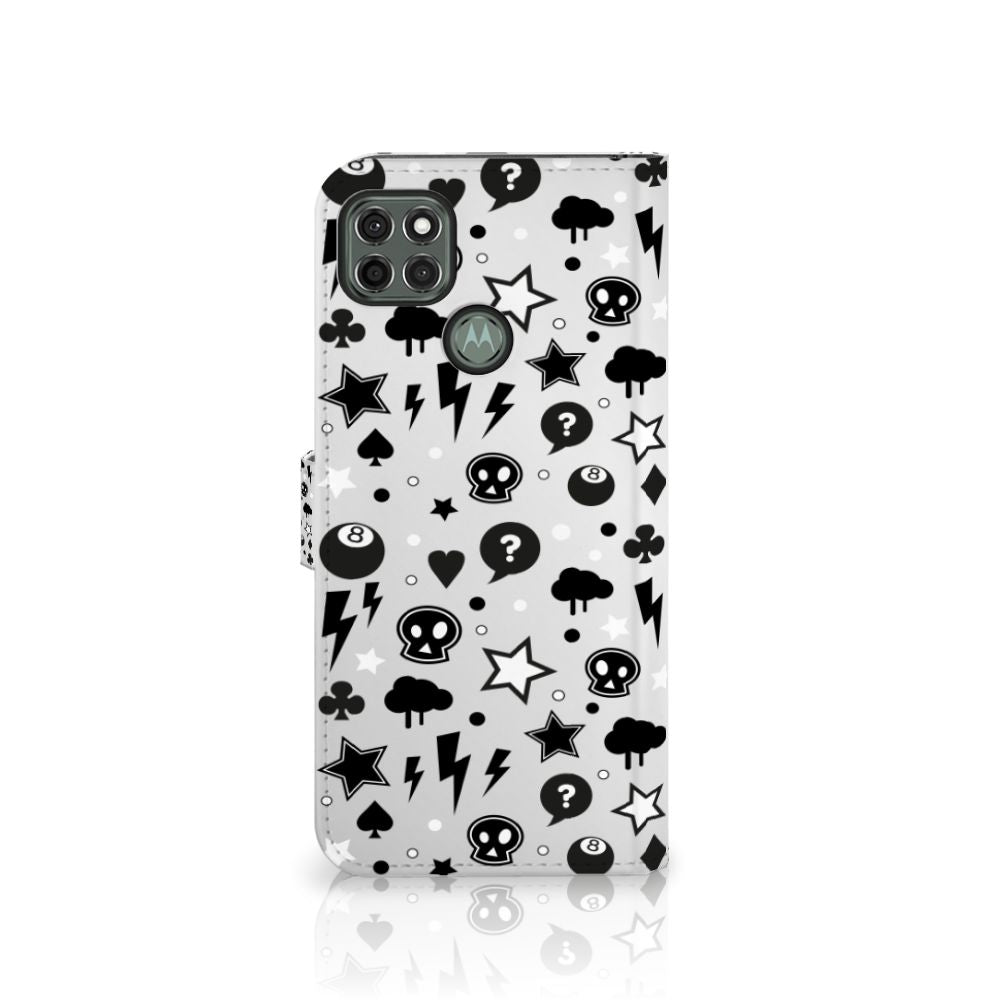 Bliksemflitsen, donderwolken, sterren en biljartballen vliegen op je af als je dit Motorola Moto G9 Power Telefoonhoesje met Naam koopt. Het bijzondere Silver Punk design is van onze eigen ontwerper en vind je in geen enkel andere winkel of webshop. Ben je fan van dit soort stoere en opvallende hoesjes, dan kun je je geluk niet op als je ons assortiment smartphone accessoires bekijkt. Het design op dit zeer populaire boekhoesje bedrukken we zelf in ons eigen magazijn. De case heeft verschillende vakjes en is aan alle zijden bedrukt met bliksemflitsen, donderwolken, sterren en biljartballen. Ook het magnetisch lipje aan de buitenkant heeft een print. De houder binnen in het hoesje is van TPU, de buitenzijde van PU-leer. Zelfs doodshoofdjes zie je voorbijkomen in het design. Om maar aan te geven dat je met dit zilveren hoesje een krachtige smartphone accessoire te pakken hebt.