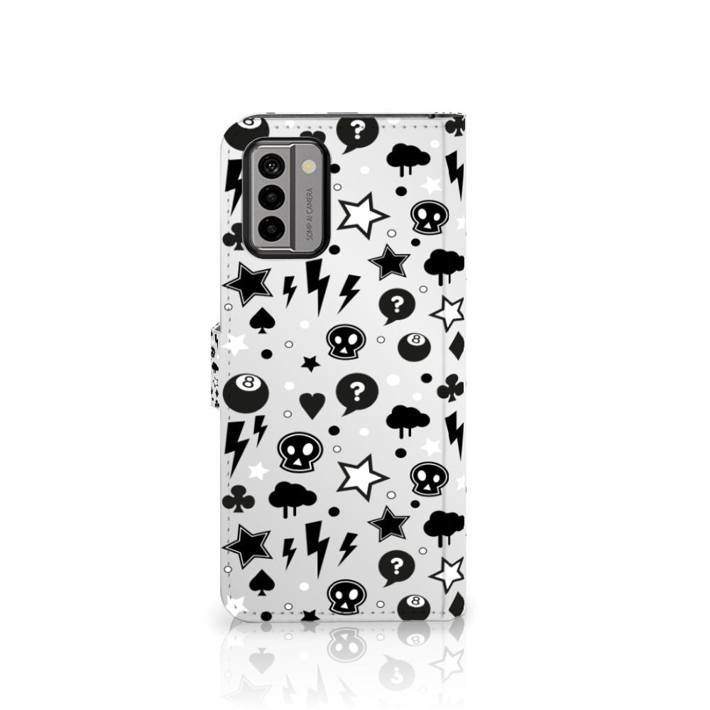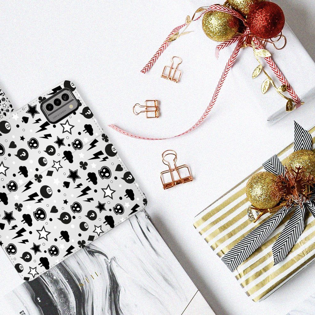 Bliksemflitsen, donderwolken, sterren en biljartballen vliegen op je af als je dit Nokia G22 Telefoonhoesje met Naam koopt. Het bijzondere Silver Punk design is van onze eigen ontwerper en vind je in geen enkel andere winkel of webshop. Ben je fan van dit soort stoere en opvallende hoesjes, dan kun je je geluk niet op als je ons assortiment smartphone accessoires bekijkt. Het design op dit zeer populaire boekhoesje bedrukken we zelf in ons eigen magazijn. De case heeft verschillende vakjes en is aan alle zijden bedrukt met bliksemflitsen, donderwolken, sterren en biljartballen. Ook het magnetisch lipje aan de buitenkant heeft een print. De houder binnen in het hoesje is van TPU, de buitenzijde van PU-leer. Zelfs doodshoofdjes zie je voorbijkomen in het design. Om maar aan te geven dat je met dit zilveren hoesje een krachtige smartphone accessoire te pakken hebt.