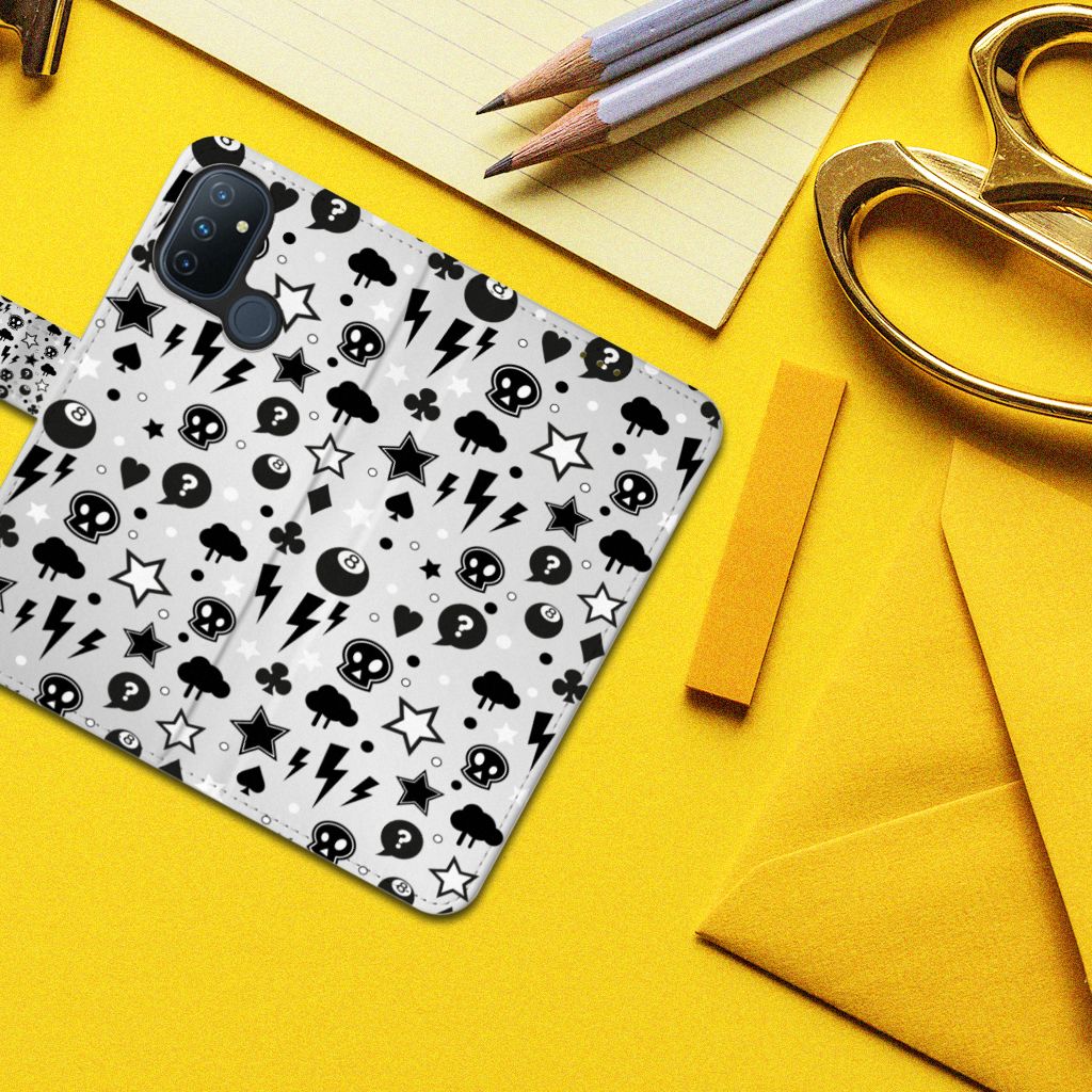 Bliksemflitsen, donderwolken, sterren en biljartballen vliegen op je af als je dit OnePlus Nord N100 Telefoonhoesje met Naam koopt. Het bijzondere Silver Punk design is van onze eigen ontwerper en vind je in geen enkel andere winkel of webshop. Ben je fan van dit soort stoere en opvallende hoesjes, dan kun je je geluk niet op als je ons assortiment smartphone accessoires bekijkt. Het design op dit zeer populaire boekhoesje bedrukken we zelf in ons eigen magazijn. De case heeft verschillende vakjes en is aan alle zijden bedrukt met bliksemflitsen, donderwolken, sterren en biljartballen. Ook het magnetisch lipje aan de buitenkant heeft een print. De houder binnen in het hoesje is van TPU, de buitenzijde van PU-leer. Zelfs doodshoofdjes zie je voorbijkomen in het design. Om maar aan te geven dat je met dit zilveren hoesje een krachtige smartphone accessoire te pakken hebt.