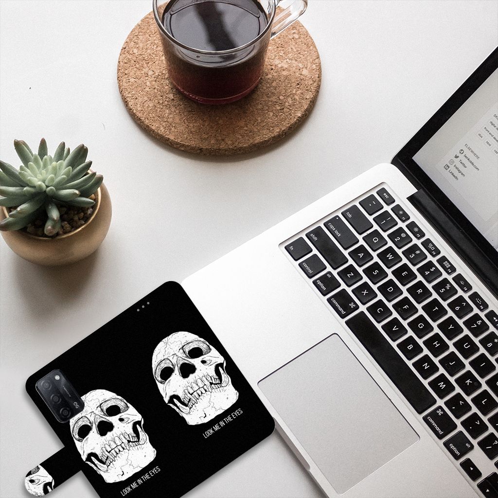 Ben je op zoek naar een uniek telefoonhoesje voor je OPPO A16/A16s/A54s? Dan ben je bij B2C Telecom aan het juiste adres! Speciaal voor jou hebben we dit prachtige Skull Eyes design in onze collectie hoesjes opgenomen. Het design wordt bedrukt op een Telefoonhoesje met Naam en heeft twee vakjes voor pasjes en een groter vakje voor briefgeld. Alle zijdes van het hoesje worden bedrukt, hoe uniek is dat? Het hoesje wordt afgesloten met een sluit lipje aan de voorkant. Wil je dit design hoesje nog iets extra's geven? Voeg dan gratis je naam of een quote toe! Is dit design hoesje toch niet helemaal wat je zocht? Ontwerp dan zelf een hoesje in ons ontwerpprogramma.