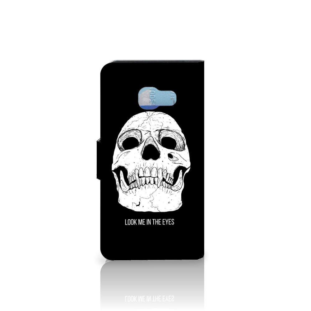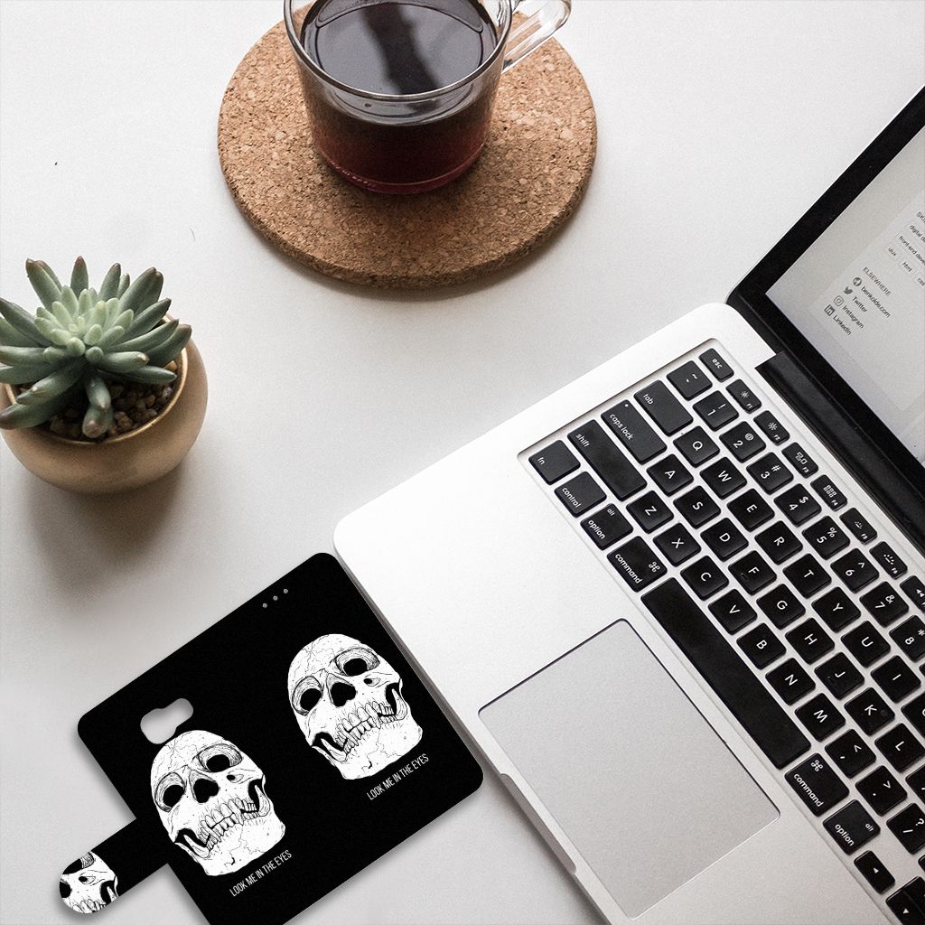 Ben je op zoek naar een uniek telefoonhoesje voor je Samsung Galaxy A3 2017? Dan ben je bij B2C Telecom aan het juiste adres! Speciaal voor jou hebben we dit prachtige Skull Eyes design in onze collectie hoesjes opgenomen. Het design wordt bedrukt op een Telefoonhoesje met Naam en heeft twee vakjes voor pasjes en een groter vakje voor briefgeld. Alle zijdes van het hoesje worden bedrukt, hoe uniek is dat? Het hoesje wordt afgesloten met een sluit lipje aan de voorkant. Wil je dit design hoesje nog iets extra's geven? Voeg dan gratis je naam of een quote toe! Is dit design hoesje toch niet helemaal wat je zocht? Ontwerp dan zelf een hoesje in ons ontwerpprogramma.