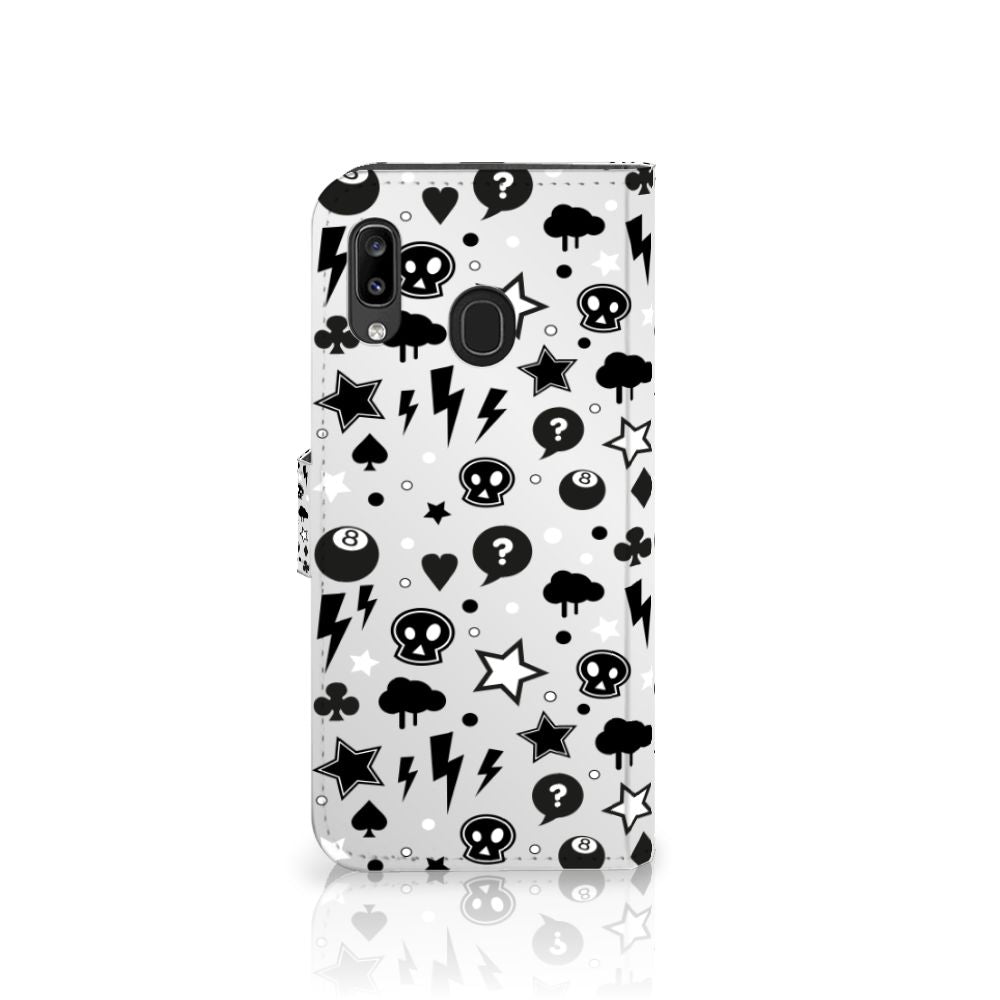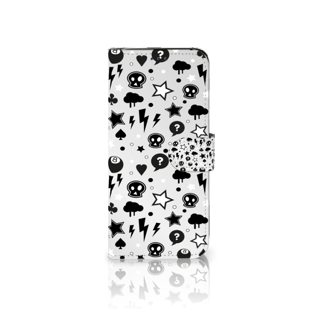 Bliksemflitsen, donderwolken, sterren en biljartballen vliegen op je af als je dit Samsung Galaxy A30 Telefoonhoesje met Naam koopt. Het bijzondere Silver Punk design is van onze eigen ontwerper en vind je in geen enkel andere winkel of webshop. Ben je fan van dit soort stoere en opvallende hoesjes, dan kun je je geluk niet op als je ons assortiment smartphone accessoires bekijkt. Het design op dit zeer populaire boekhoesje bedrukken we zelf in ons eigen magazijn. De case heeft verschillende vakjes en is aan alle zijden bedrukt met bliksemflitsen, donderwolken, sterren en biljartballen. Ook het magnetisch lipje aan de buitenkant heeft een print. De houder binnen in het hoesje is van TPU, de buitenzijde van PU-leer. Zelfs doodshoofdjes zie je voorbijkomen in het design. Om maar aan te geven dat je met dit zilveren hoesje een krachtige smartphone accessoire te pakken hebt.