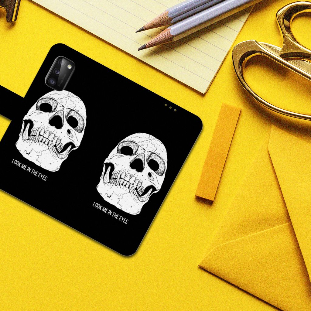 Ben je op zoek naar een uniek telefoonhoesje voor je Samsung Galaxy A41? Dan ben je bij B2C Telecom aan het juiste adres! Speciaal voor jou hebben we dit prachtige Skull Eyes design in onze collectie hoesjes opgenomen. Het design wordt bedrukt op een Telefoonhoesje met Naam en heeft twee vakjes voor pasjes en een groter vakje voor briefgeld. Alle zijdes van het hoesje worden bedrukt, hoe uniek is dat? Het hoesje wordt afgesloten met een sluit lipje aan de voorkant. Wil je dit design hoesje nog iets extra's geven? Voeg dan gratis je naam of een quote toe! Is dit design hoesje toch niet helemaal wat je zocht? Ontwerp dan zelf een hoesje in ons ontwerpprogramma.