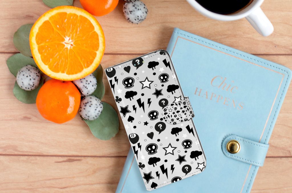 Bliksemflitsen, donderwolken, sterren en biljartballen vliegen op je af als je dit Samsung Galaxy A52 Telefoonhoesje met Naam koopt. Het bijzondere Silver Punk design is van onze eigen ontwerper en vind je in geen enkel andere winkel of webshop. Ben je fan van dit soort stoere en opvallende hoesjes, dan kun je je geluk niet op als je ons assortiment smartphone accessoires bekijkt. Het design op dit zeer populaire boekhoesje bedrukken we zelf in ons eigen magazijn. De case heeft verschillende vakjes en is aan alle zijden bedrukt met bliksemflitsen, donderwolken, sterren en biljartballen. Ook het magnetisch lipje aan de buitenkant heeft een print. De houder binnen in het hoesje is van TPU, de buitenzijde van PU-leer. Zelfs doodshoofdjes zie je voorbijkomen in het design. Om maar aan te geven dat je met dit zilveren hoesje een krachtige smartphone accessoire te pakken hebt.