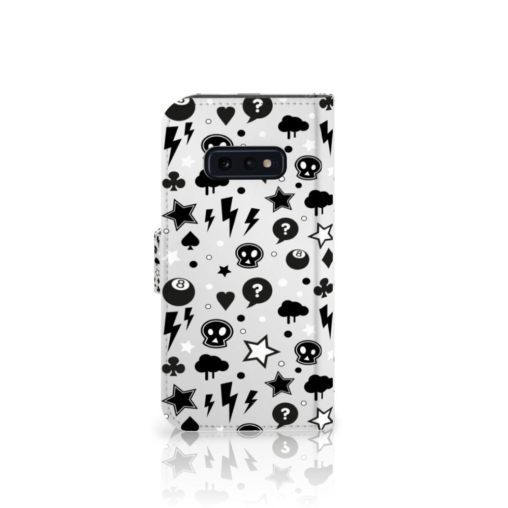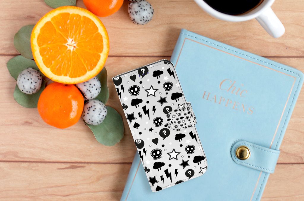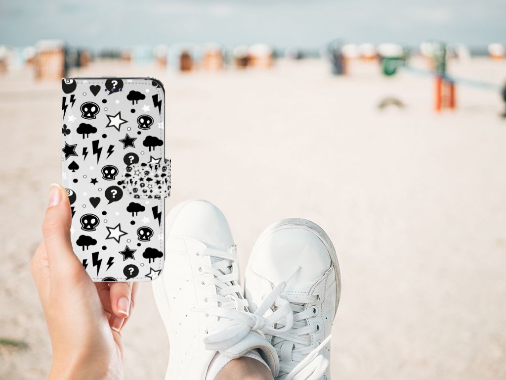Bliksemflitsen, donderwolken, sterren en biljartballen vliegen op je af als je dit Samsung Galaxy S10e Telefoonhoesje met Naam koopt. Het bijzondere Silver Punk design is van onze eigen ontwerper en vind je in geen enkel andere winkel of webshop. Ben je fan van dit soort stoere en opvallende hoesjes, dan kun je je geluk niet op als je ons assortiment smartphone accessoires bekijkt. Het design op dit zeer populaire boekhoesje bedrukken we zelf in ons eigen magazijn. De case heeft verschillende vakjes en is aan alle zijden bedrukt met bliksemflitsen, donderwolken, sterren en biljartballen. Ook het magnetisch lipje aan de buitenkant heeft een print. De houder binnen in het hoesje is van TPU, de buitenzijde van PU-leer. Zelfs doodshoofdjes zie je voorbijkomen in het design. Om maar aan te geven dat je met dit zilveren hoesje een krachtige smartphone accessoire te pakken hebt.