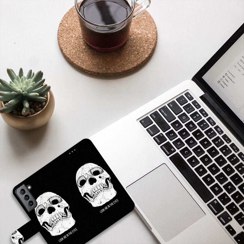Ben je op zoek naar een uniek telefoonhoesje voor je Samsung Galaxy S21 FE? Dan ben je bij B2C Telecom aan het juiste adres! Speciaal voor jou hebben we dit prachtige Skull Eyes design in onze collectie hoesjes opgenomen. Het design wordt bedrukt op een Telefoonhoesje met Naam en heeft twee vakjes voor pasjes en een groter vakje voor briefgeld. Alle zijdes van het hoesje worden bedrukt, hoe uniek is dat? Het hoesje wordt afgesloten met een sluit lipje aan de voorkant. Wil je dit design hoesje nog iets extra's geven? Voeg dan gratis je naam of een quote toe! Is dit design hoesje toch niet helemaal wat je zocht? Ontwerp dan zelf een hoesje in ons ontwerpprogramma.