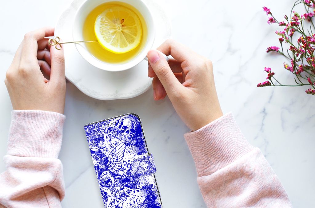 Dit ietwat duistere blauwe patroon tref je vaak aan op een bandana. Een bandana wordt om het hoofd of de hals gedragen. Een bandana is ideaal als je op de racefiets, motor of de brommer zit en jezelf wilt beschermen tegen wind, opwaaiend stof of fijn zand. Leden van motorclubs dragen dit soort bandana’s dan ook graag. Wil je jouw Samsung Galaxy S7 Edge optimaal beschermen tegen opwaaiend stof, zand of andere bedreigingen, dan is dit design hoesje met Angel Skull Blue design een zeer goede keus. Het design staat op een Telefoonhoesje met Naam. Dit smartphonehoesje beschermt jouw telefoon aan alle zijden en beschikt over verschillende opbergvakjes voor pasjes en briefgeld. De case sluit perfect af met het lipje aan de buitenkant. De houder aan de binnenzijde is van TPU. Alle zijden van het hoesje worden bedrukt, inclusief het lipje