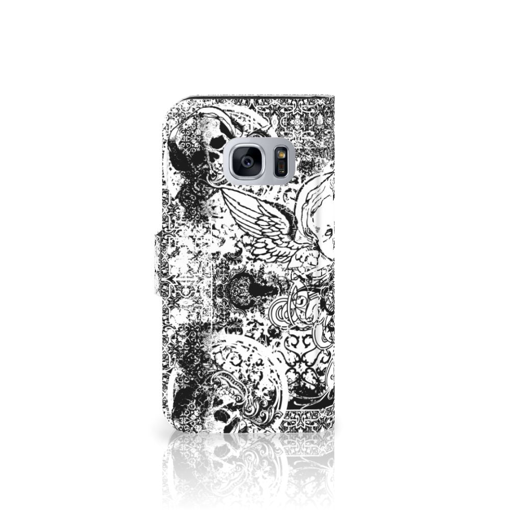 Dit mysterieuze patroon tref je vaak aan op een bandana. Een bandana is een kledingstuk dat om het hoofd of de hals wordt gedragen. Behalve als kledingstuk vindt de bandana soms toepassing als signaal. Een bandana is het eenvoudigste middel als je op de motor of de brommer zit en jezelf wilt beschermen tegen wind, opwaaiend stof of fijn zand. Leden van bekende motorclubs dragen dit kledingstuk dan ook graag, om meerdere redenen. Wil je jouw Samsung Galaxy S7 optimaal beschermen tegen opwaaiend stof, zand of andere bedreigingen, dan is dit design hoesje met Skulls Angel patroon een zeer goede keus. Het design staat op een boekhoesje. Dit Telefoonhoesje met Naam beschermt jouw telefoon aan alle zijden en beschikt over verschillende opbergvakjes voor pasjes en briefgeld. De case sluit perfect af met het lipje aan de buitenkant. De houder aan de binnenzijde is van TPU. Alle zijden van het hoesje worden bedrukt, inclusief het lipje.