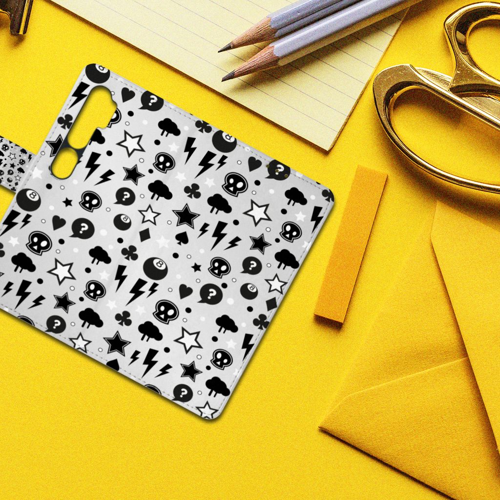 Bliksemflitsen, donderwolken, sterren en biljartballen vliegen op je af als je dit Xiaomi Mi Note 10 Pro Telefoonhoesje met Naam koopt. Het bijzondere Silver Punk design is van onze eigen ontwerper en vind je in geen enkel andere winkel of webshop. Ben je fan van dit soort stoere en opvallende hoesjes, dan kun je je geluk niet op als je ons assortiment smartphone accessoires bekijkt. Het design op dit zeer populaire boekhoesje bedrukken we zelf in ons eigen magazijn. De case heeft verschillende vakjes en is aan alle zijden bedrukt met bliksemflitsen, donderwolken, sterren en biljartballen. Ook het magnetisch lipje aan de buitenkant heeft een print. De houder binnen in het hoesje is van TPU, de buitenzijde van PU-leer. Zelfs doodshoofdjes zie je voorbijkomen in het design. Om maar aan te geven dat je met dit zilveren hoesje een krachtige smartphone accessoire te pakken hebt.